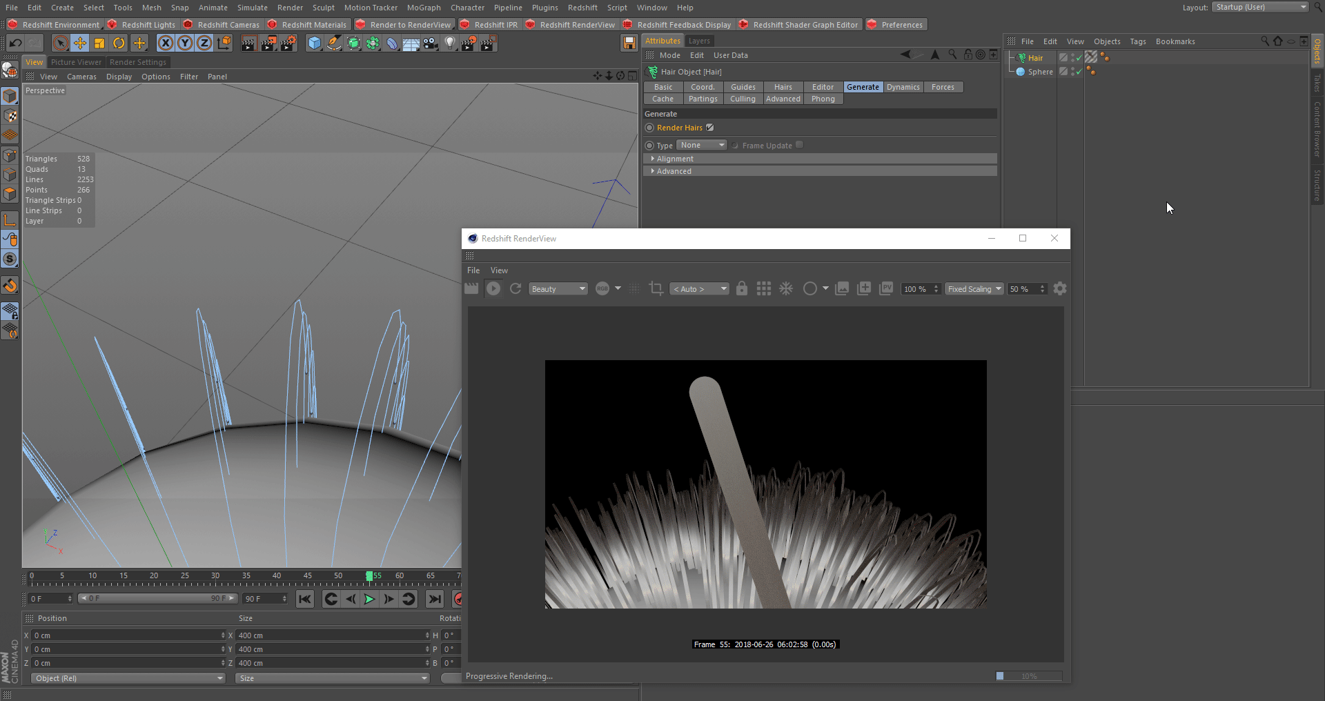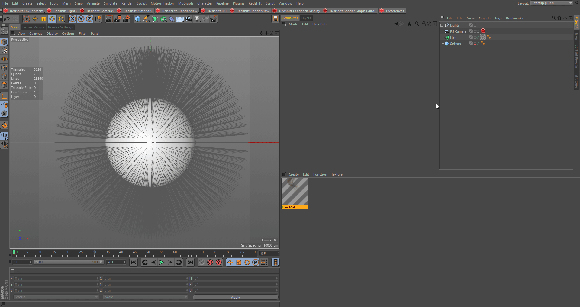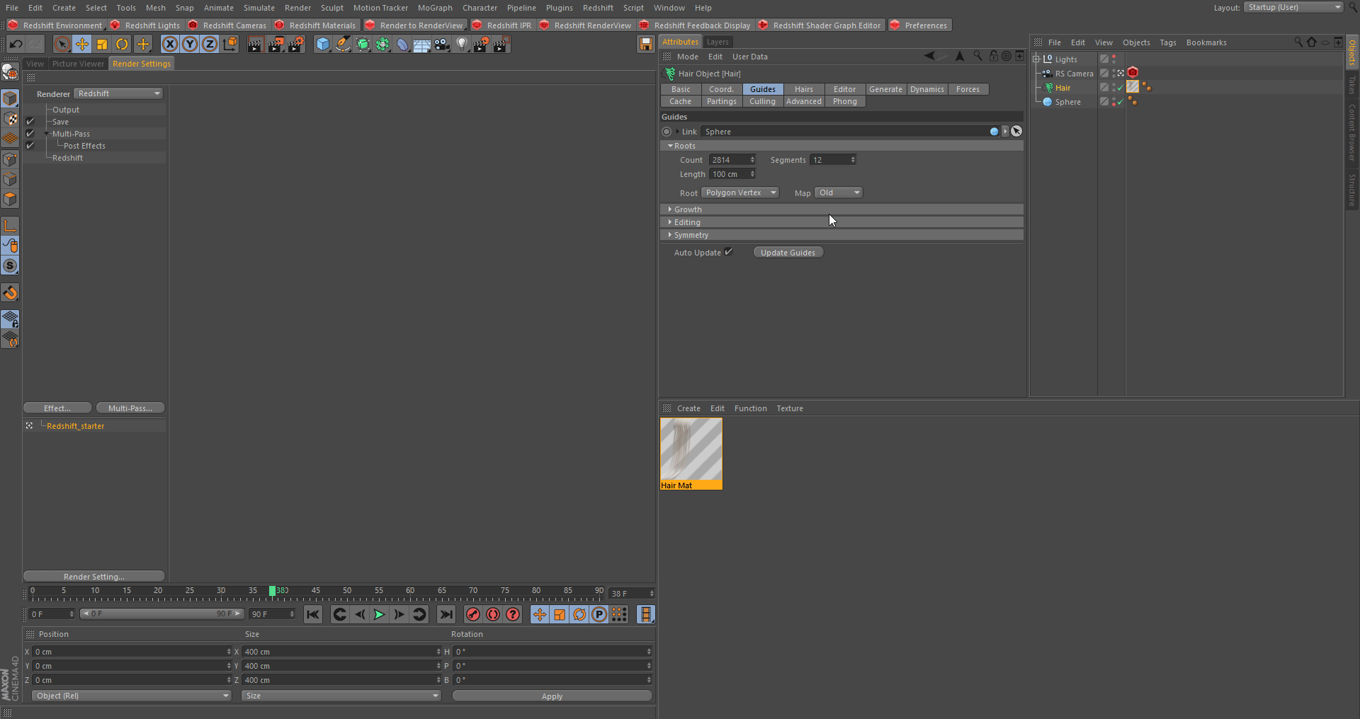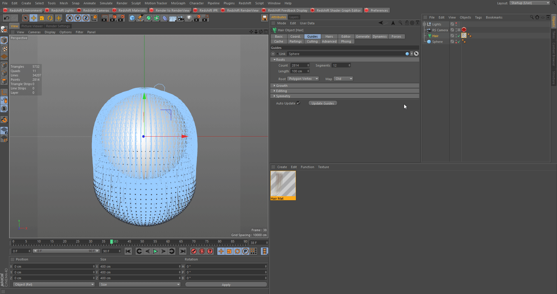 Let's see how we can render the Cinema 4D Hair Object inside of Redshift. Below we have set up a basic hair object on a sphere and adjusted some of the base settings to produce more hair. Our Hair object will render without the need for any tags.