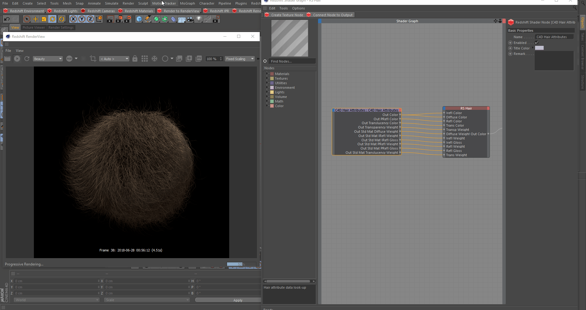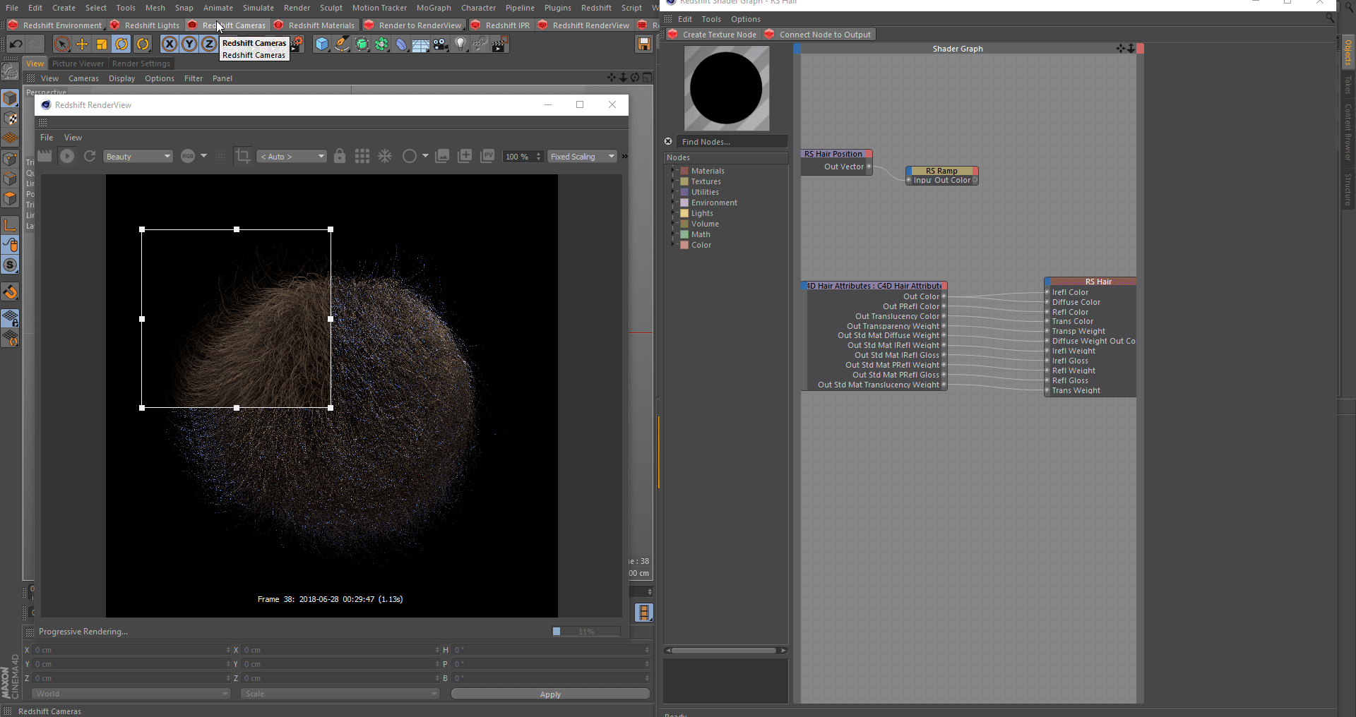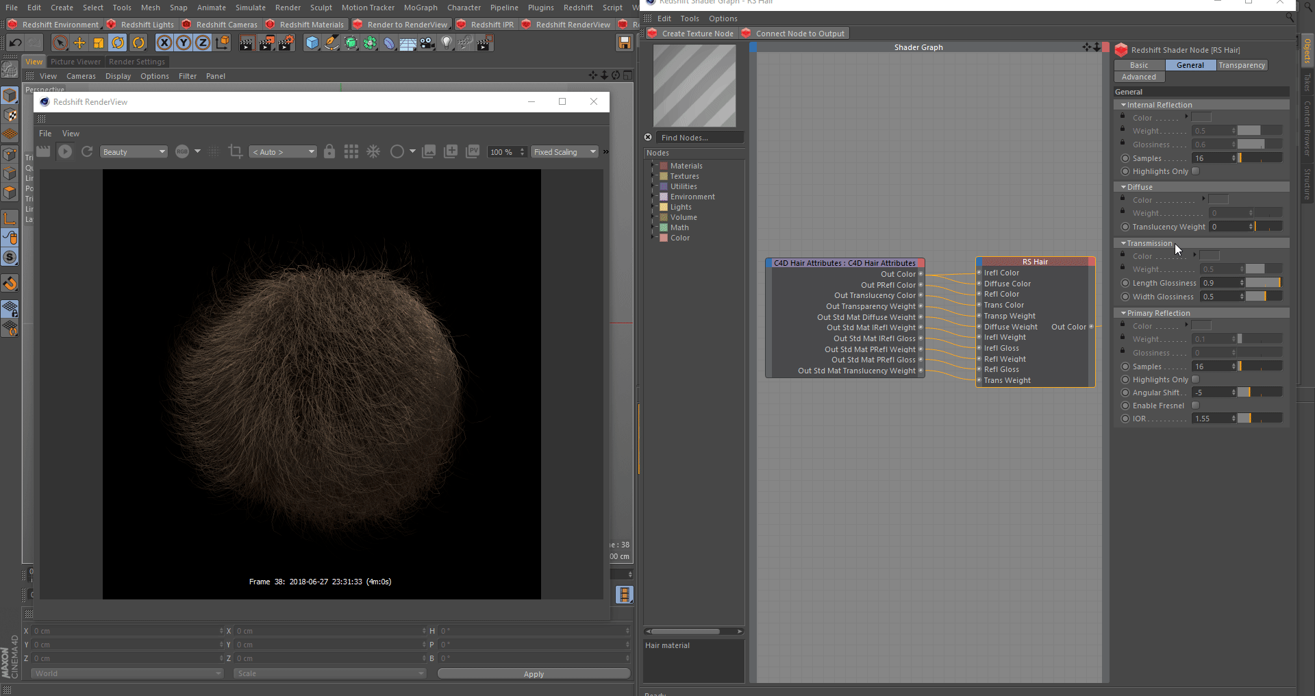While the default Cinema 4D material has a lot of flexibility and can give very good results we can also use the Redshift Hair Material and have the ability for custom shading inside our graph. The default RS Hair material will use the C4D Hair Attributes node, which will access the blended result of all Cinema 4D Hair materials attached to the hair object. The RS Hair material will then take over allowing the use of redshift nodes for custom shading.