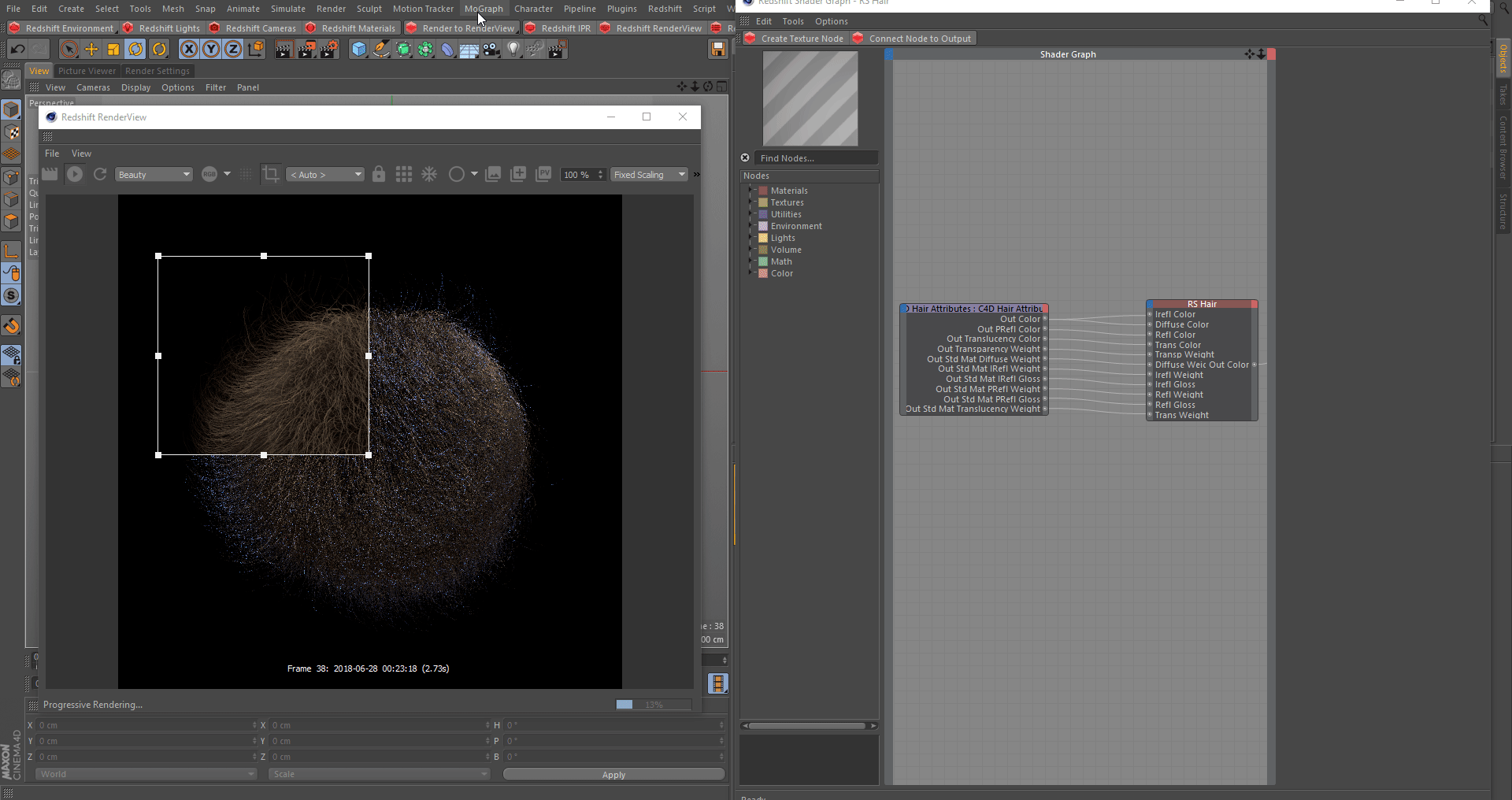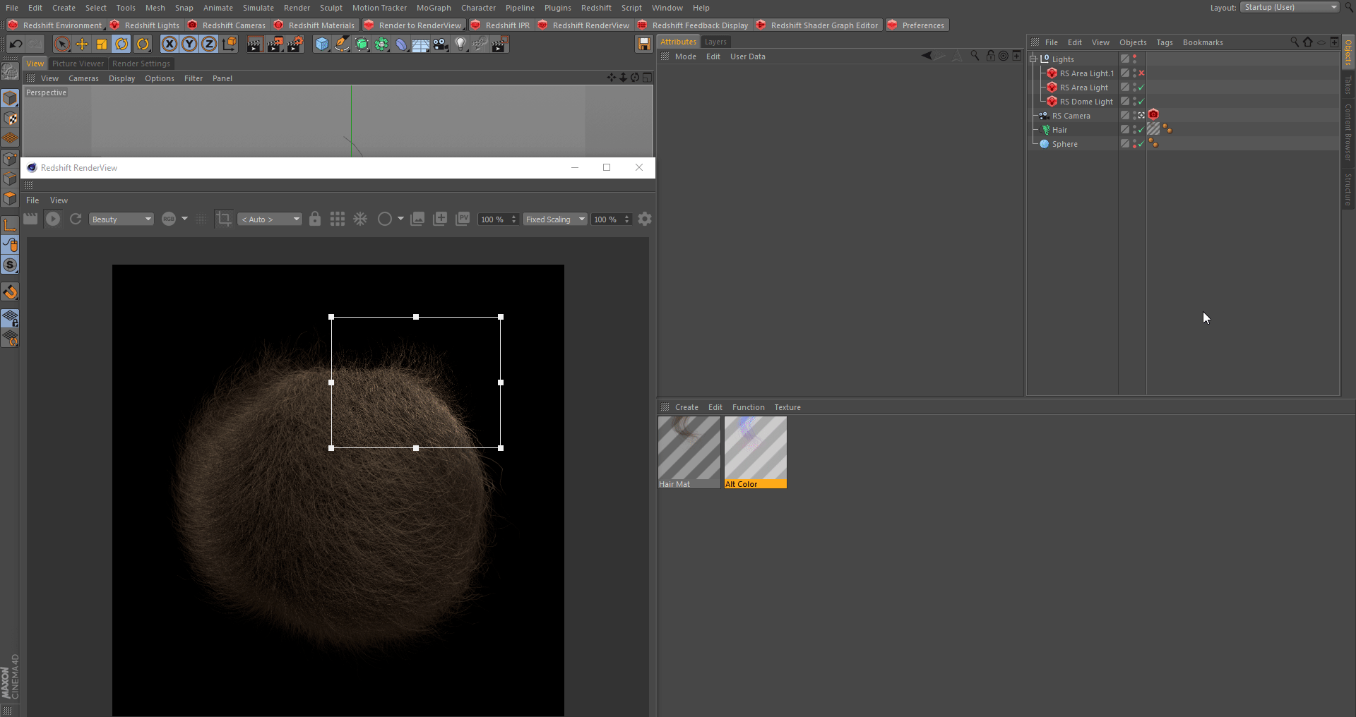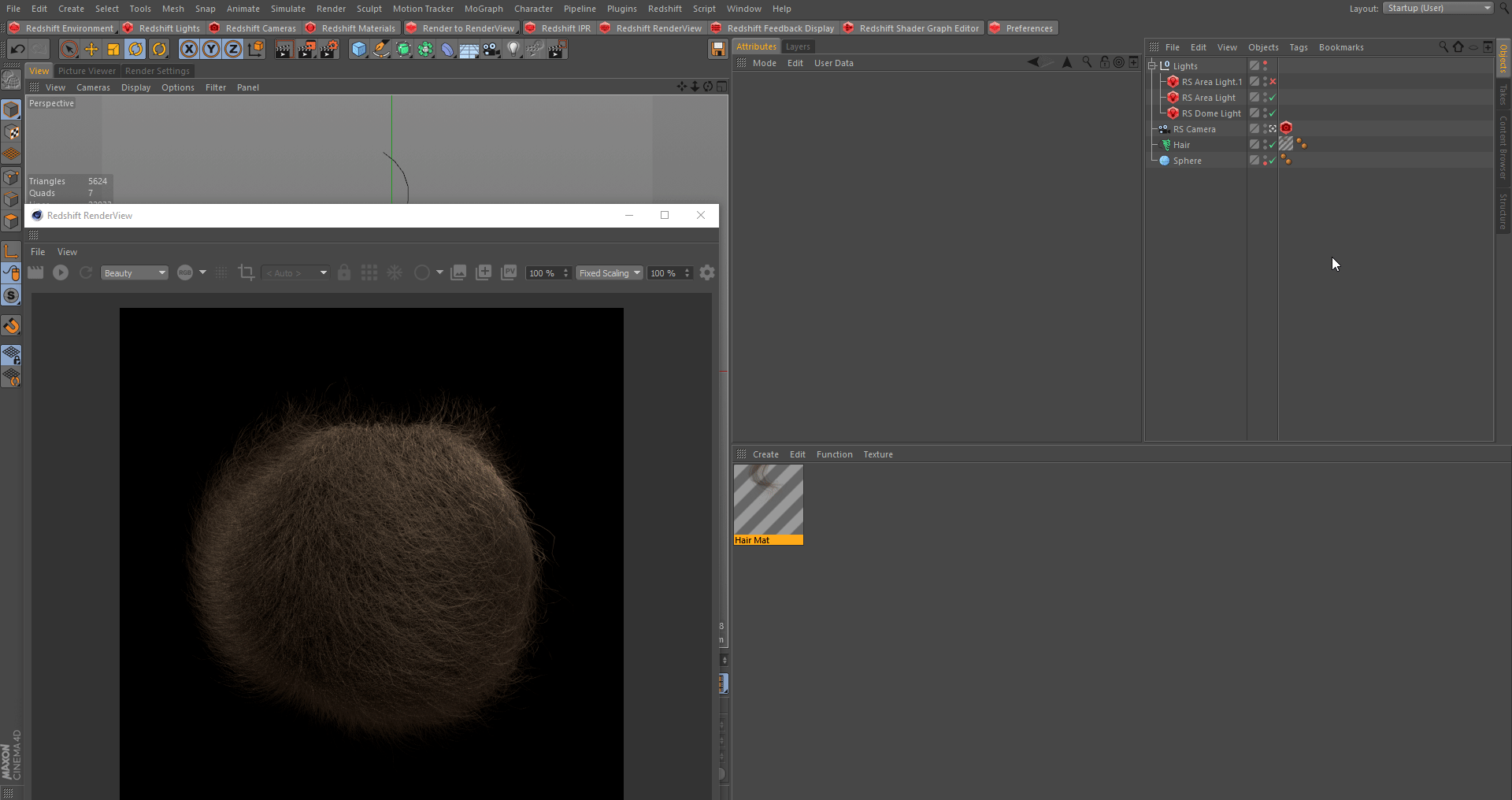 While the default Cinema 4D material has a lot of flexibility and can give very good results we can also use the Redshift Hair Material and have the ability for custom shading inside our graph. The default RS Hair material will use the C4D Hair Attributes node, which will access the blended result of all Cinema 4D Hair materials attached to the hair object. The RS Hair material will then take over allowing the use of redshift nodes for custom shading.