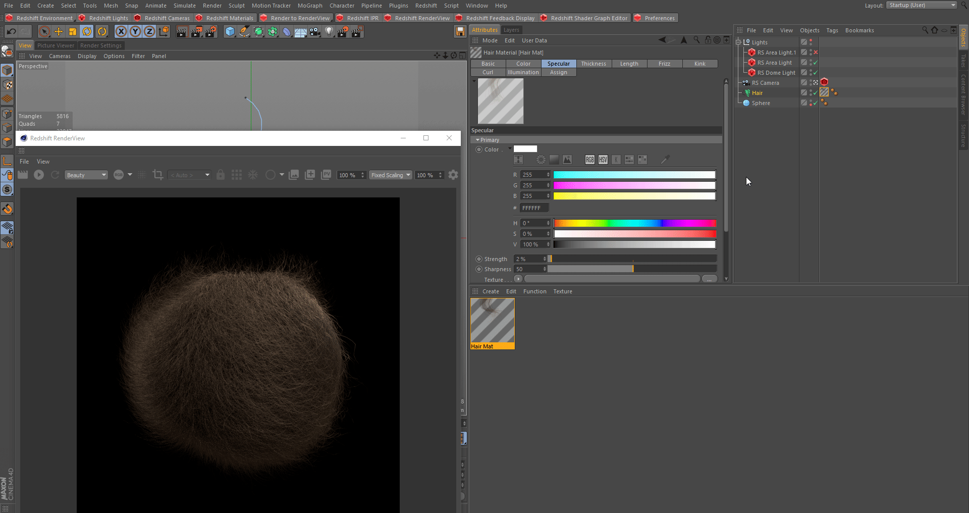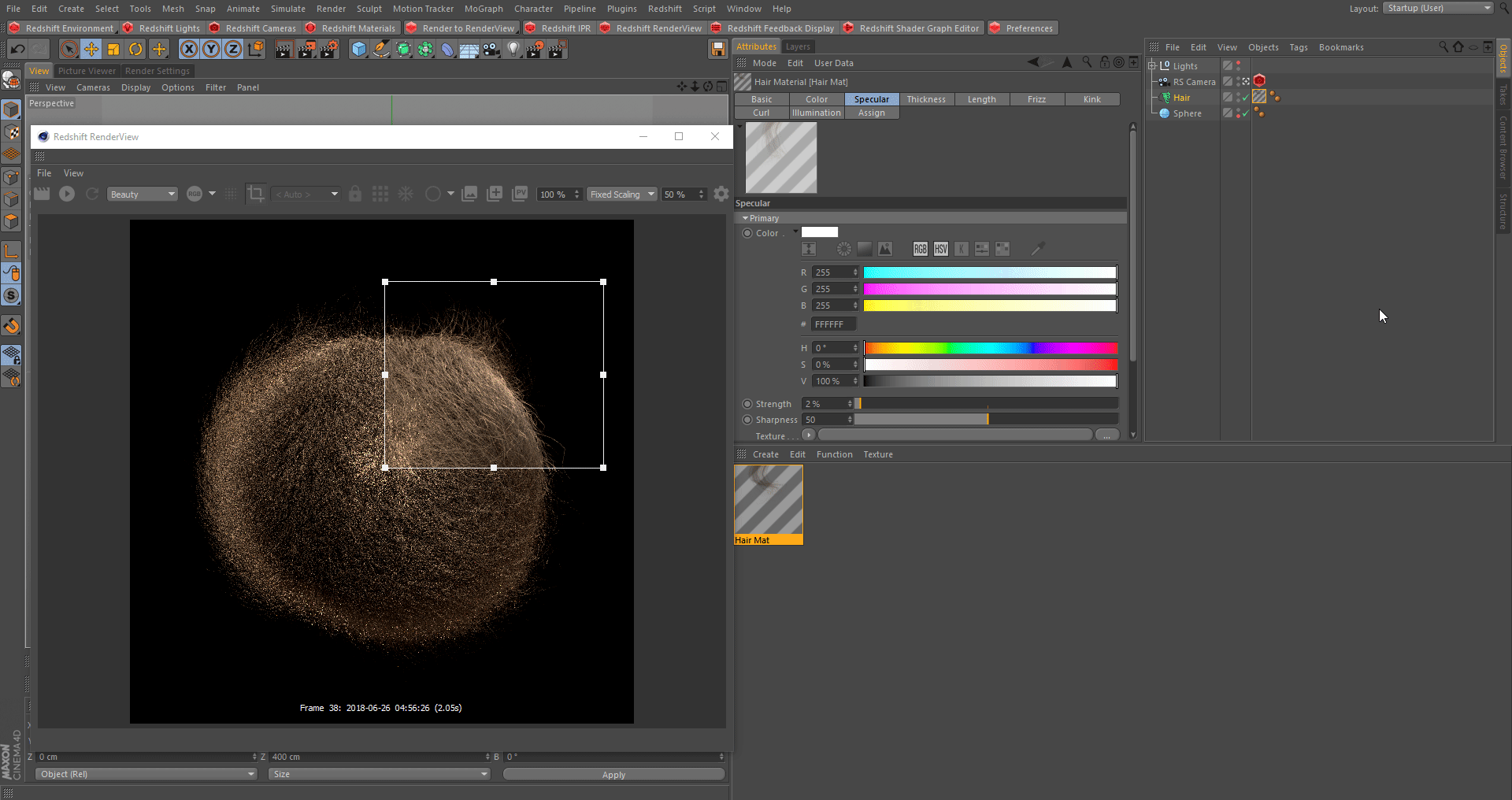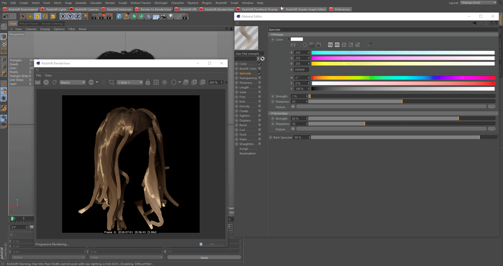 Now the reason our hair looks like it has no material applied or the color channel is not working, has to do with the specular channel. Due to the way Redshift's hair model is set up, the Cinema 4D Hair material's specular has an extremely strong effect in Redshift. So we are going to lower the strength down to 1-2%.