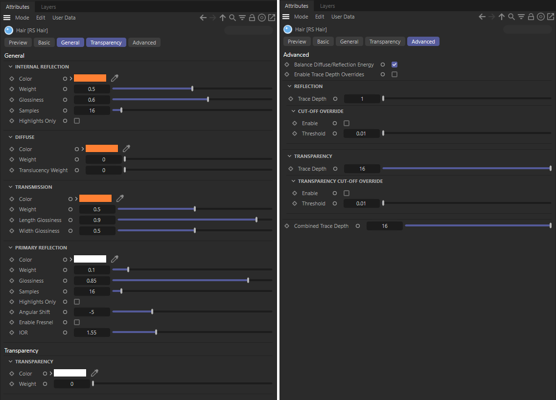 Now let's enable some of the other C4D Hair material channels, to add more detail to our hair. Below you can see what settings were used to get the result.