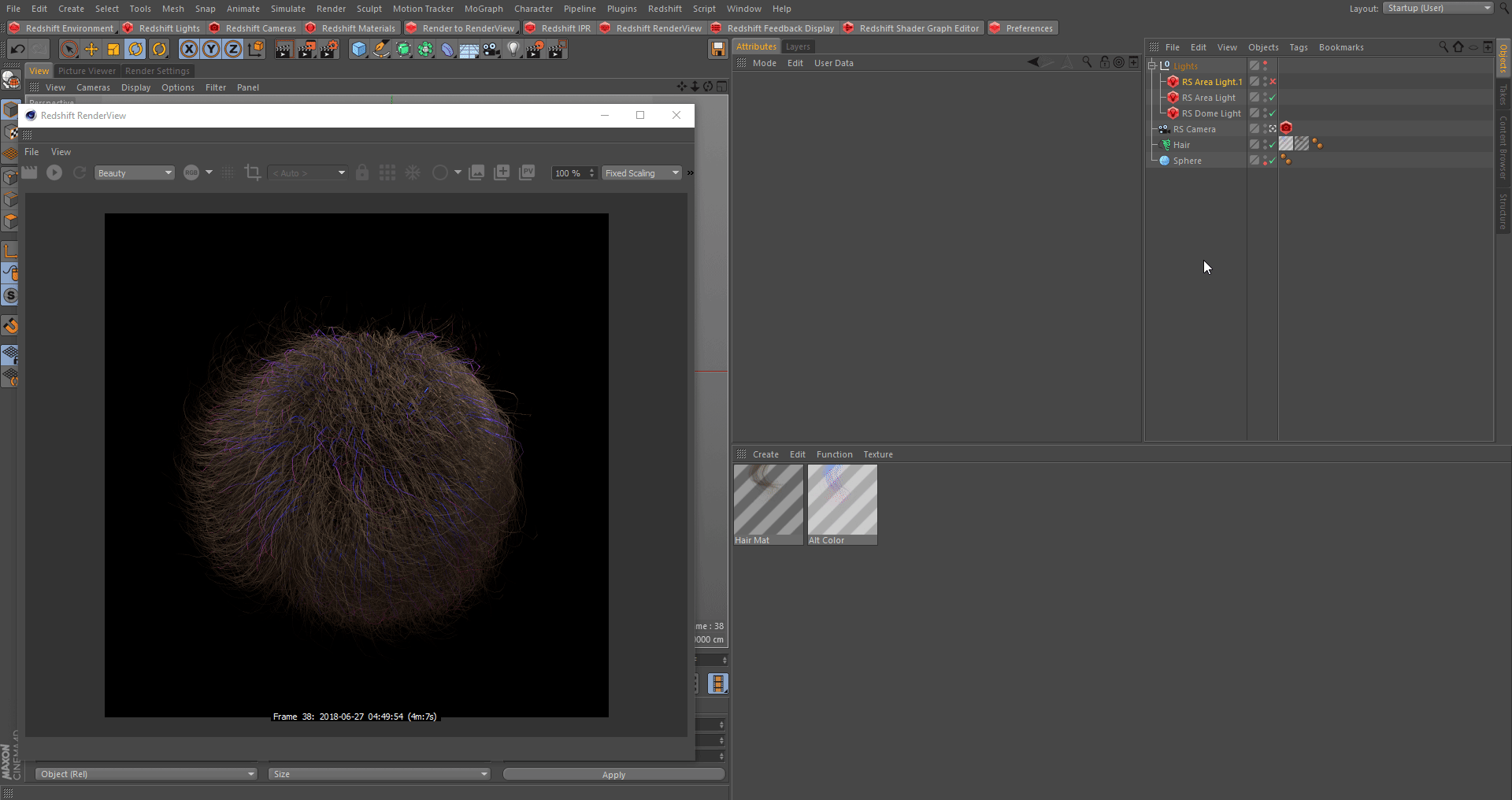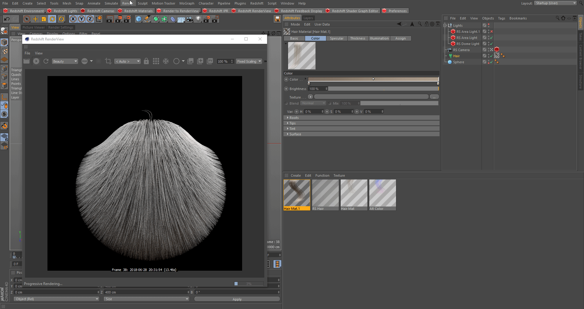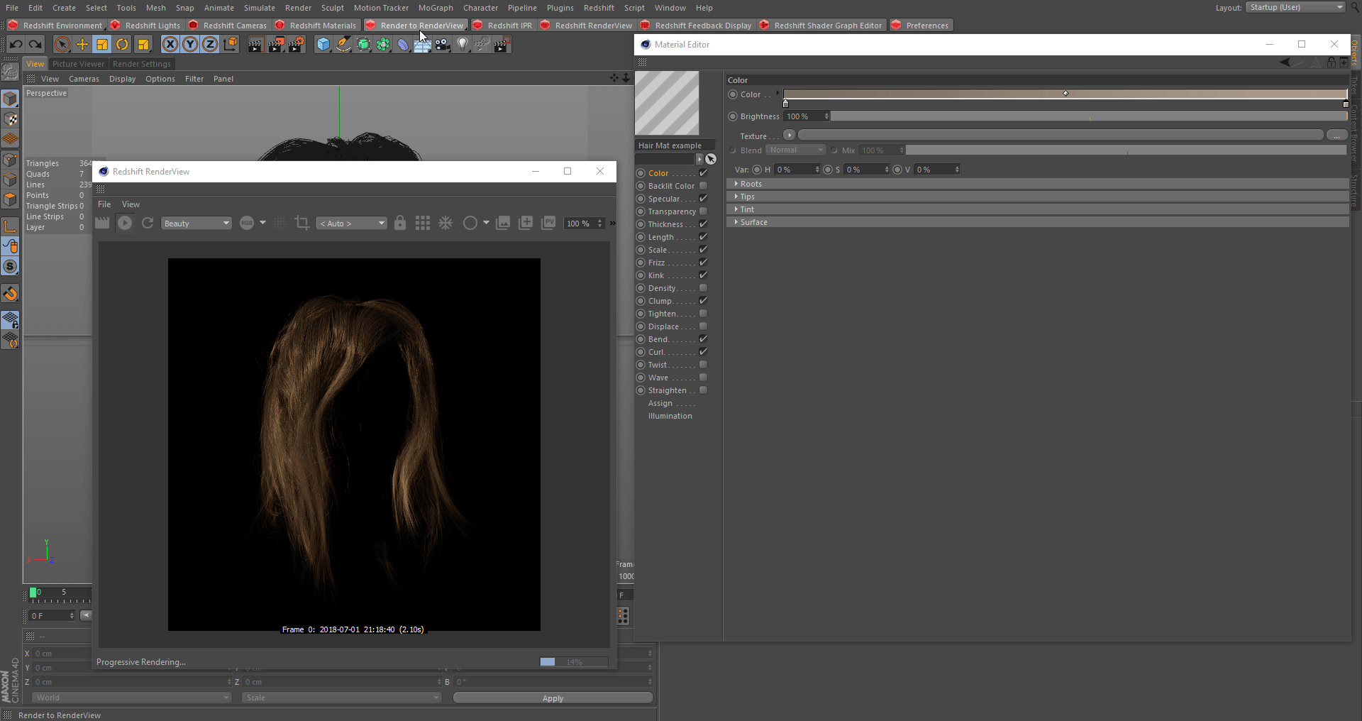 Redshift supports the rendering of native Cinema 4D Hair and Feather objects. Redshift by default will translate the hair data based on Cinema 4D's built in Hair Material attached to the Hair object. Using the built-in Hair Material we can control the color as well as the geometric shape of our strands with parameters such as: Thickness, Length, Frizz, Kink, Curl, Twist etc. We can use Cinema 4D's built Hair Material for shading at the same time as Redshift's RS Hair material shader, that accesses Cinema 4D's material parameters through a C4D Hair Attributes node, allowing for further customized shading.