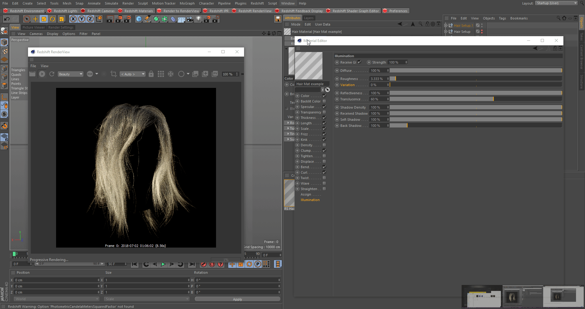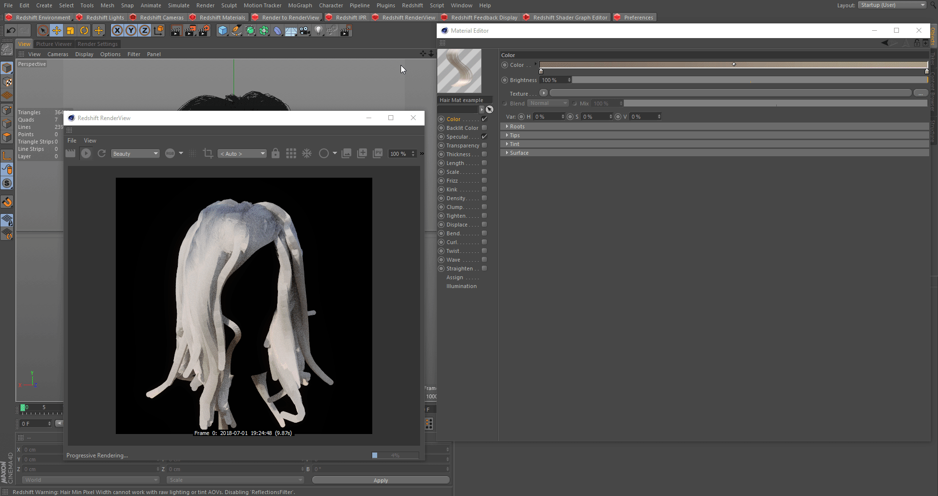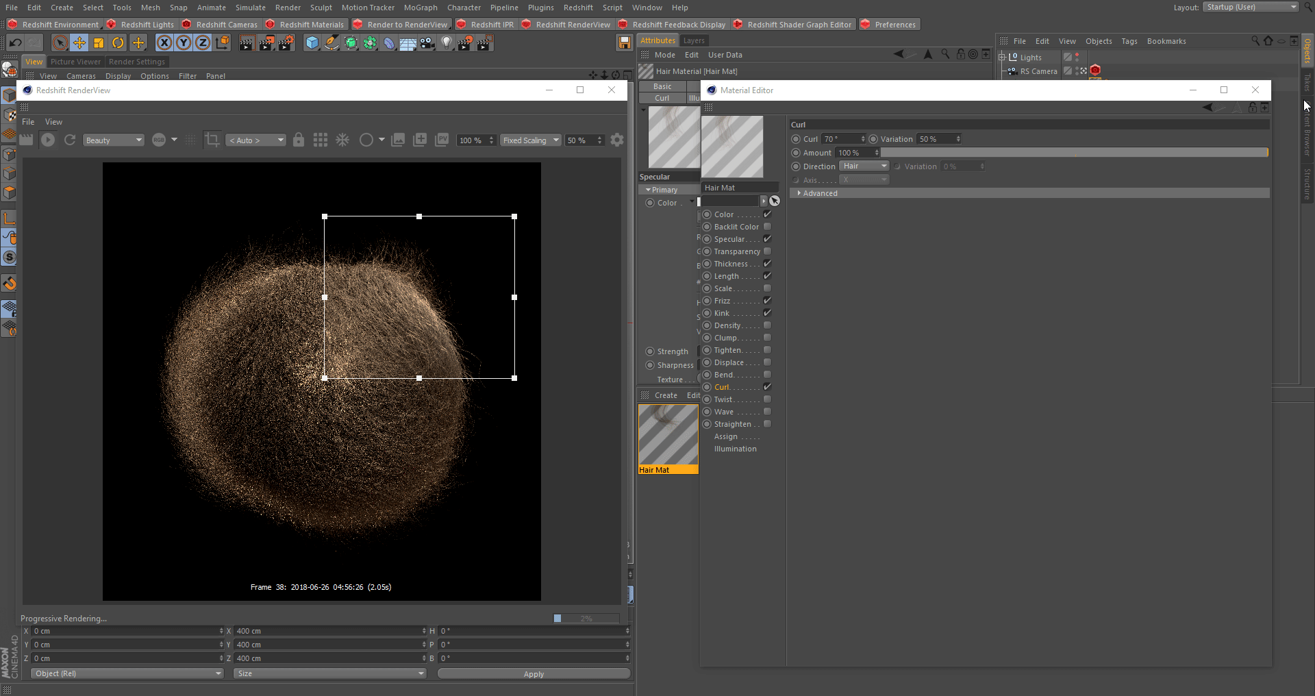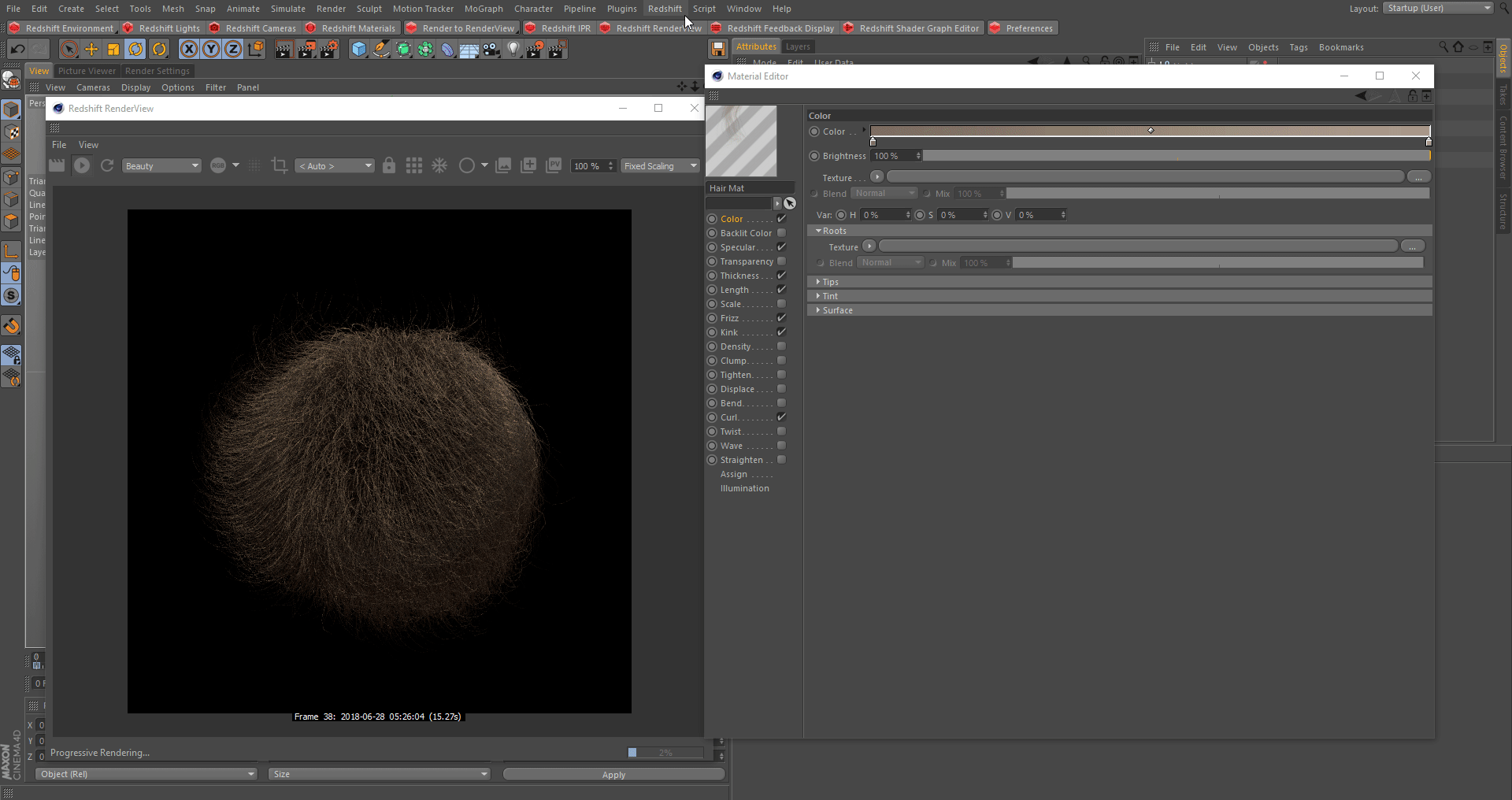 Redshift supports the rendering of native Cinema 4D Hair and Feather objects. Redshift by default will translate the hair data based on Cinema 4D's built in Hair Material attached to the Hair object. Using the built-in Hair Material we can control the color as well as the geometric shape of our strands with parameters such as: Thickness, Length, Frizz, Kink, Curl, Twist etc. We can use Cinema 4D's built Hair Material for shading at the same time as Redshift's RS Hair material shader, that accesses Cinema 4D's material parameters through a C4D Hair Attributes node, allowing for further customized shading.