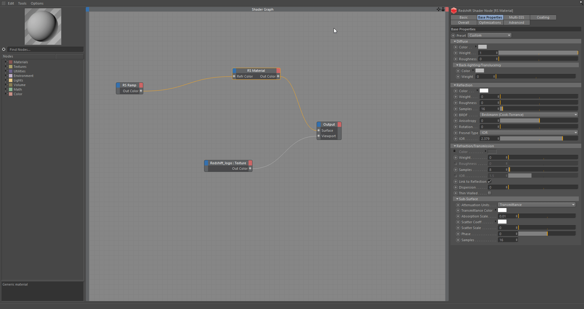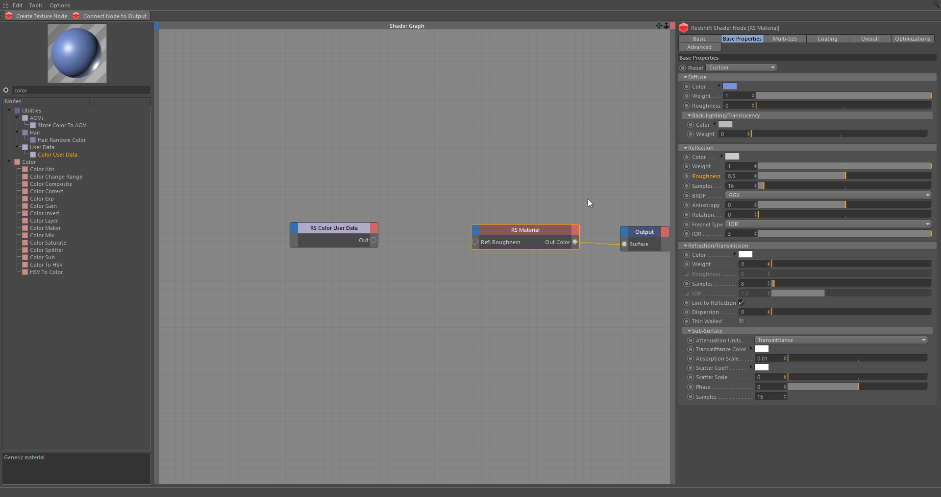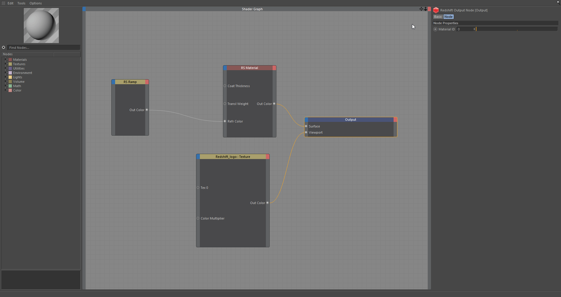The Shader Graph allows you to create and personalize complex materials inside of Redshift, these materials are composed of Shader Nodes. The Redshift Shader Graph defines the structure and the processing flow of the shading process.