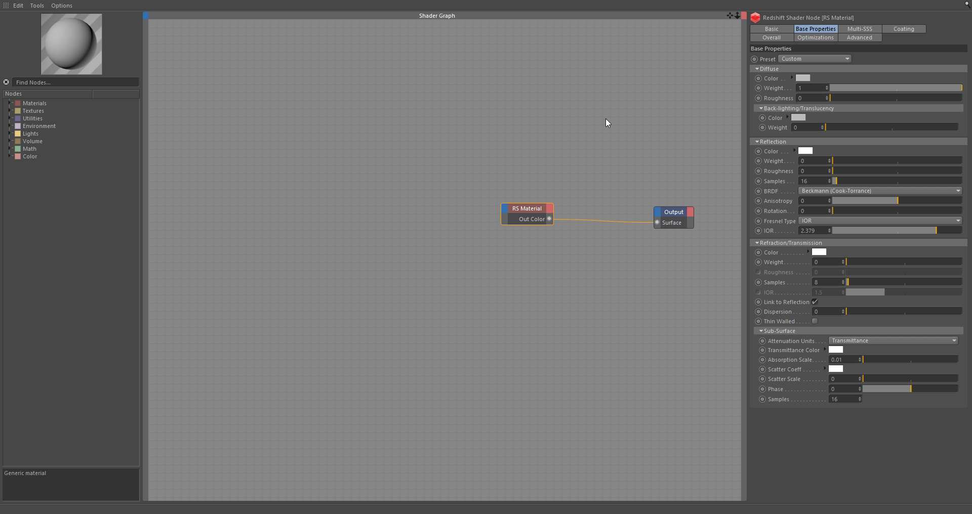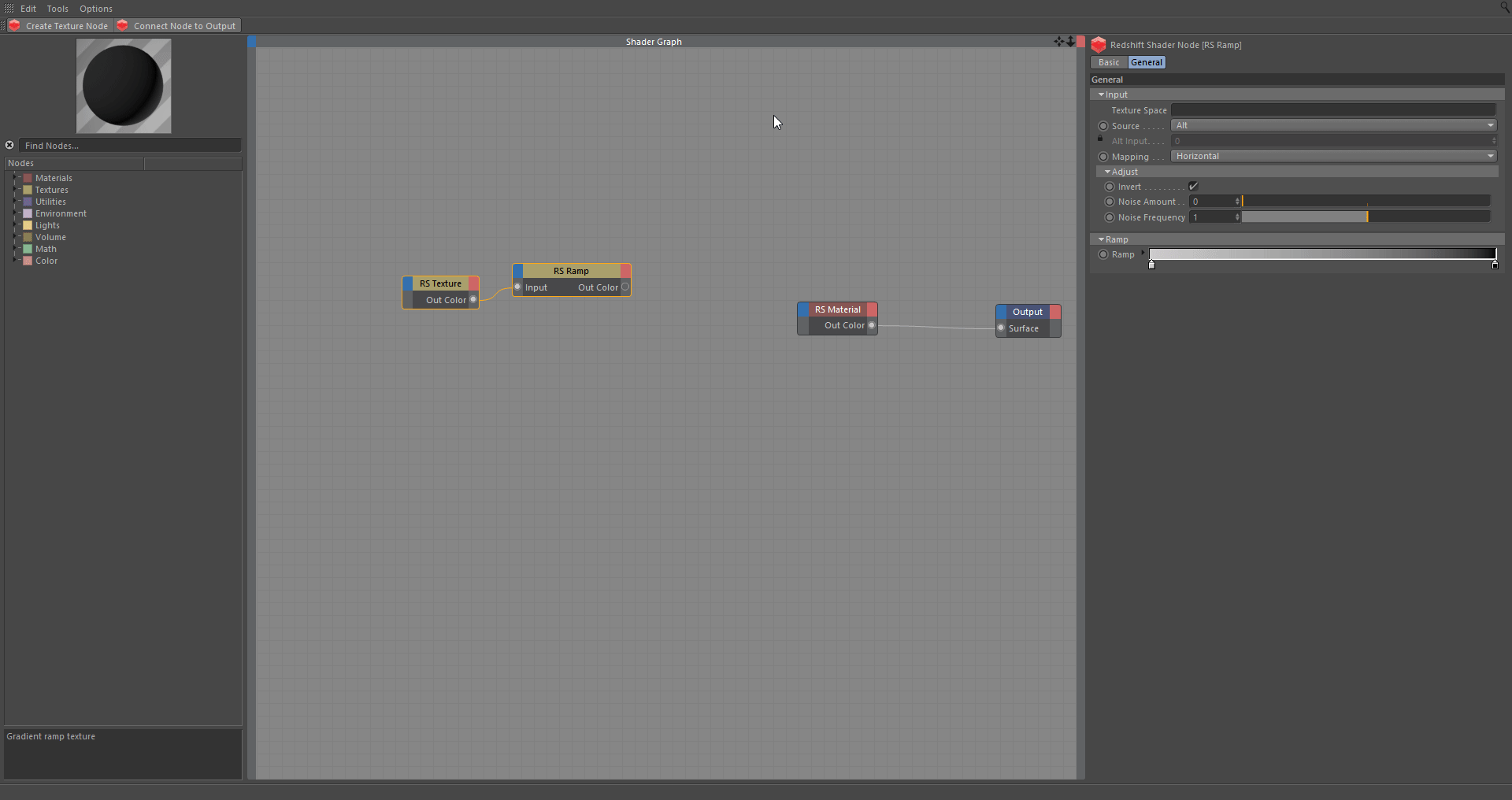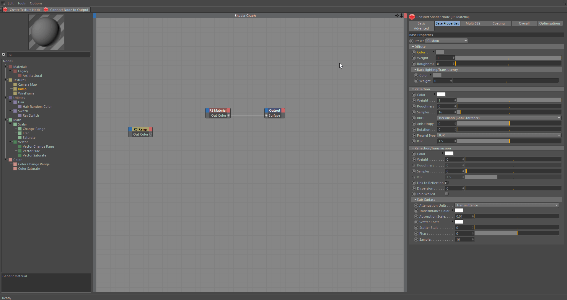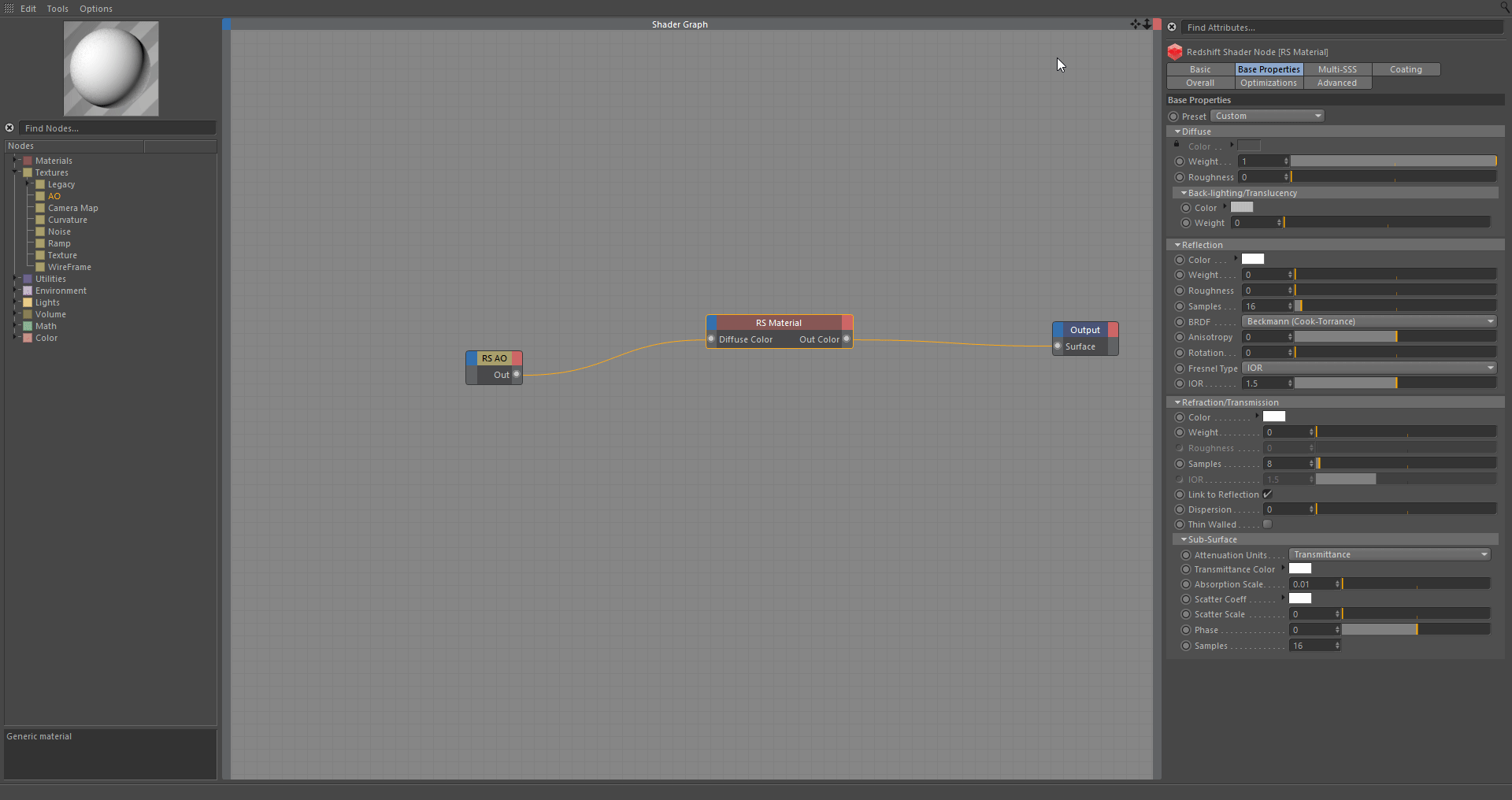 The Shader Graph allows you to create and personalize complex materials inside of Redshift, these materials are composed of Shader Nodes. The Redshift Shader Graph defines the structure and the processing flow of the shading process.