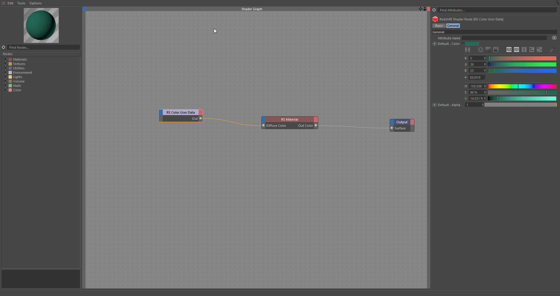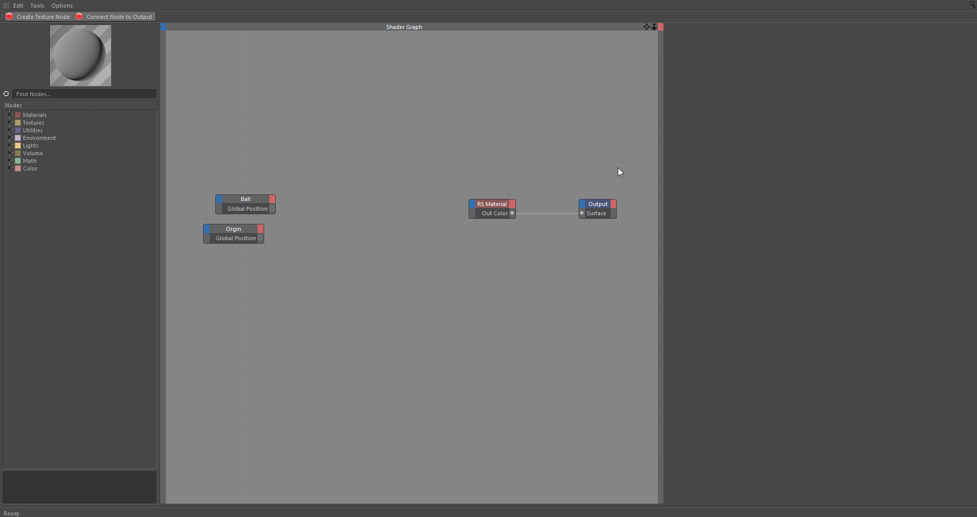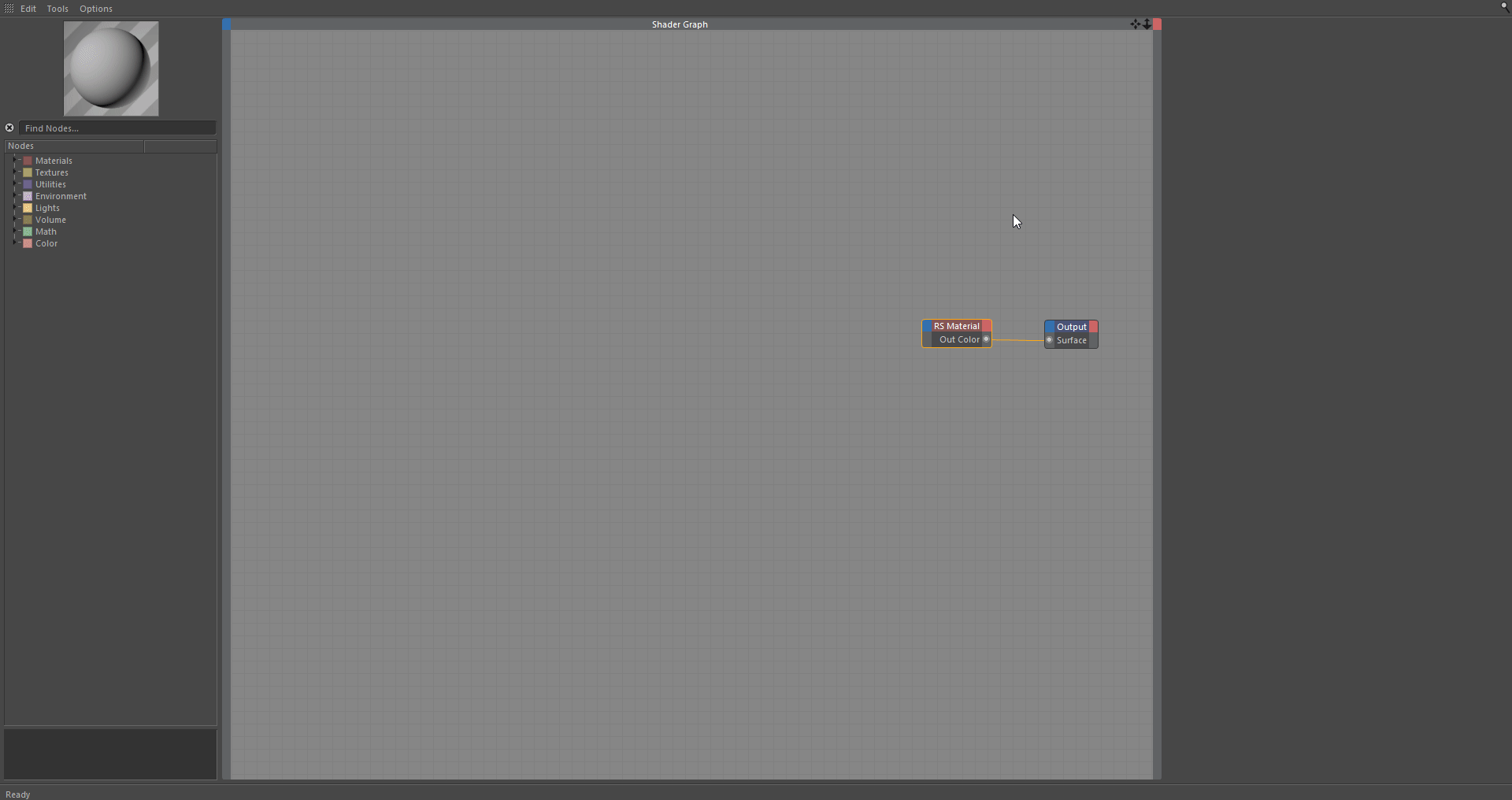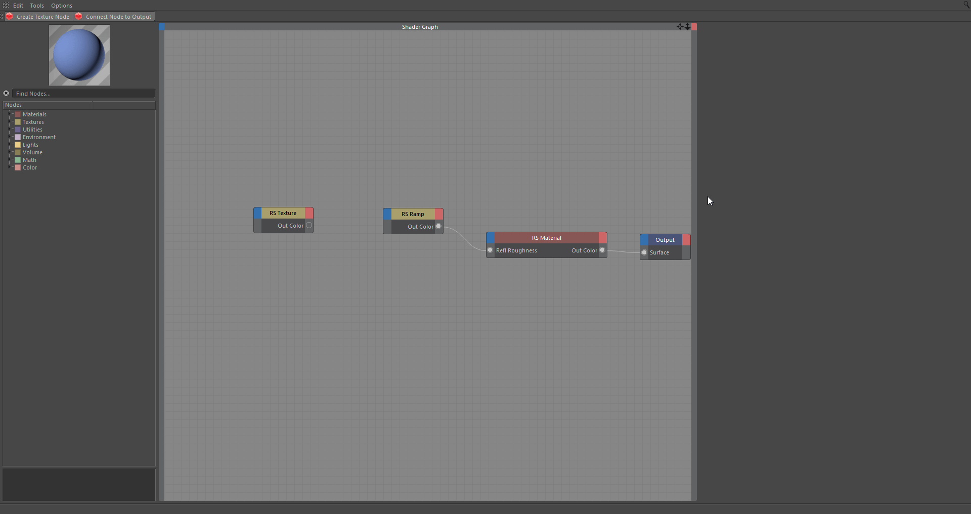 There are 8 different Categories of nodes to choose to from that include; Materials, Textures, Utilities, Environment, Lights, Volume, Math, and Color. Nodes inherit the color from their respected Categories once brought into the Graph Area.