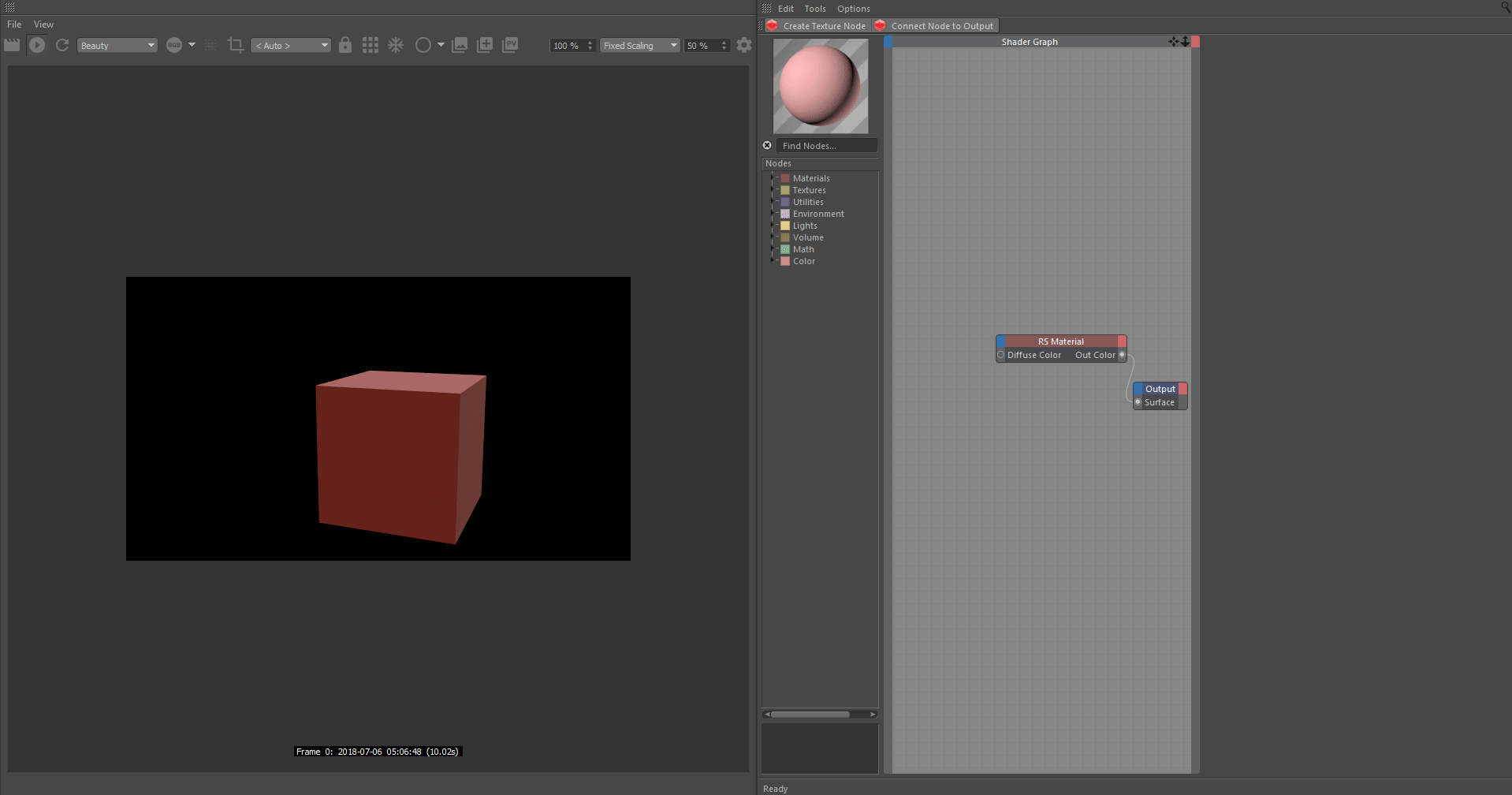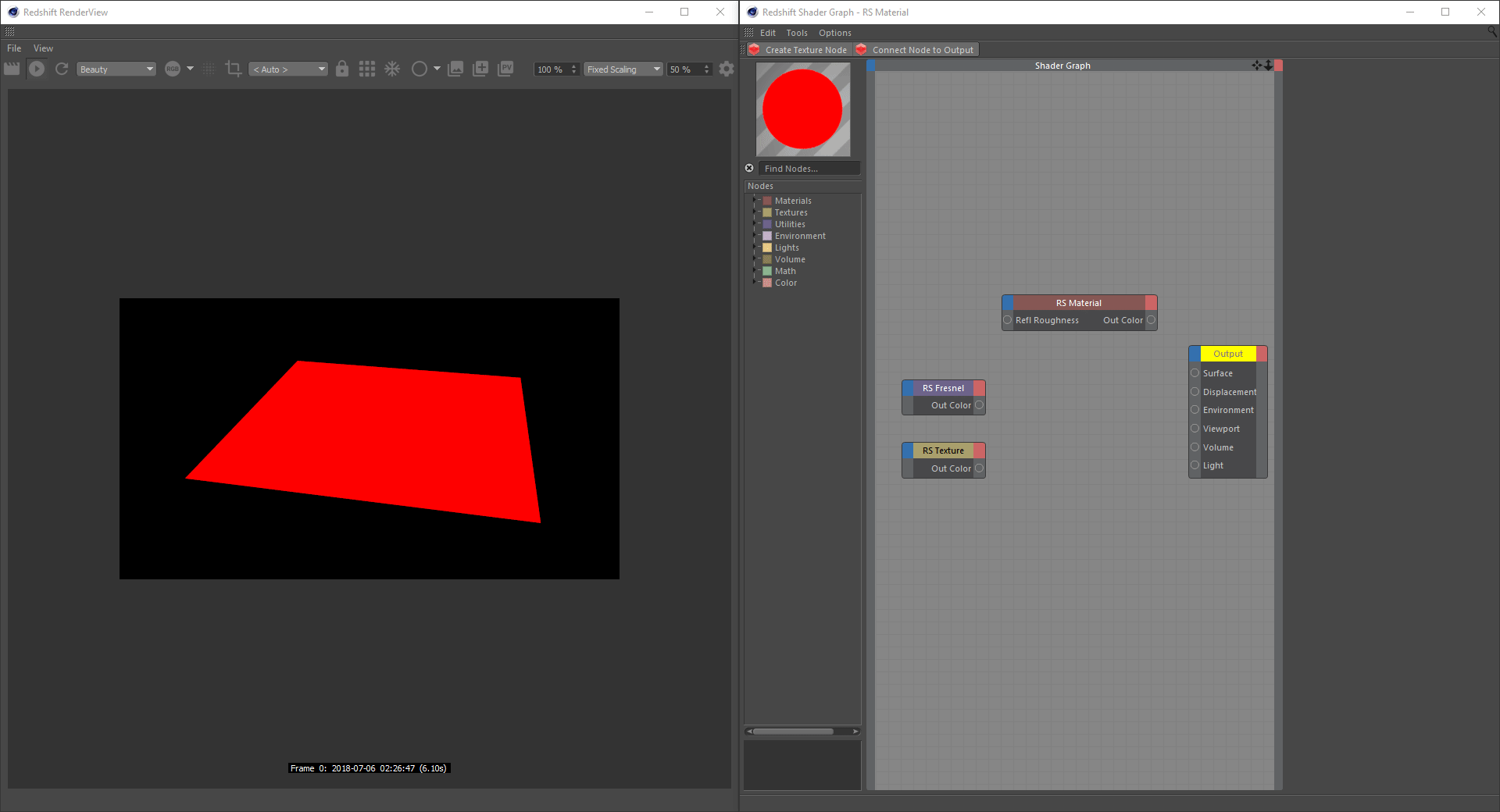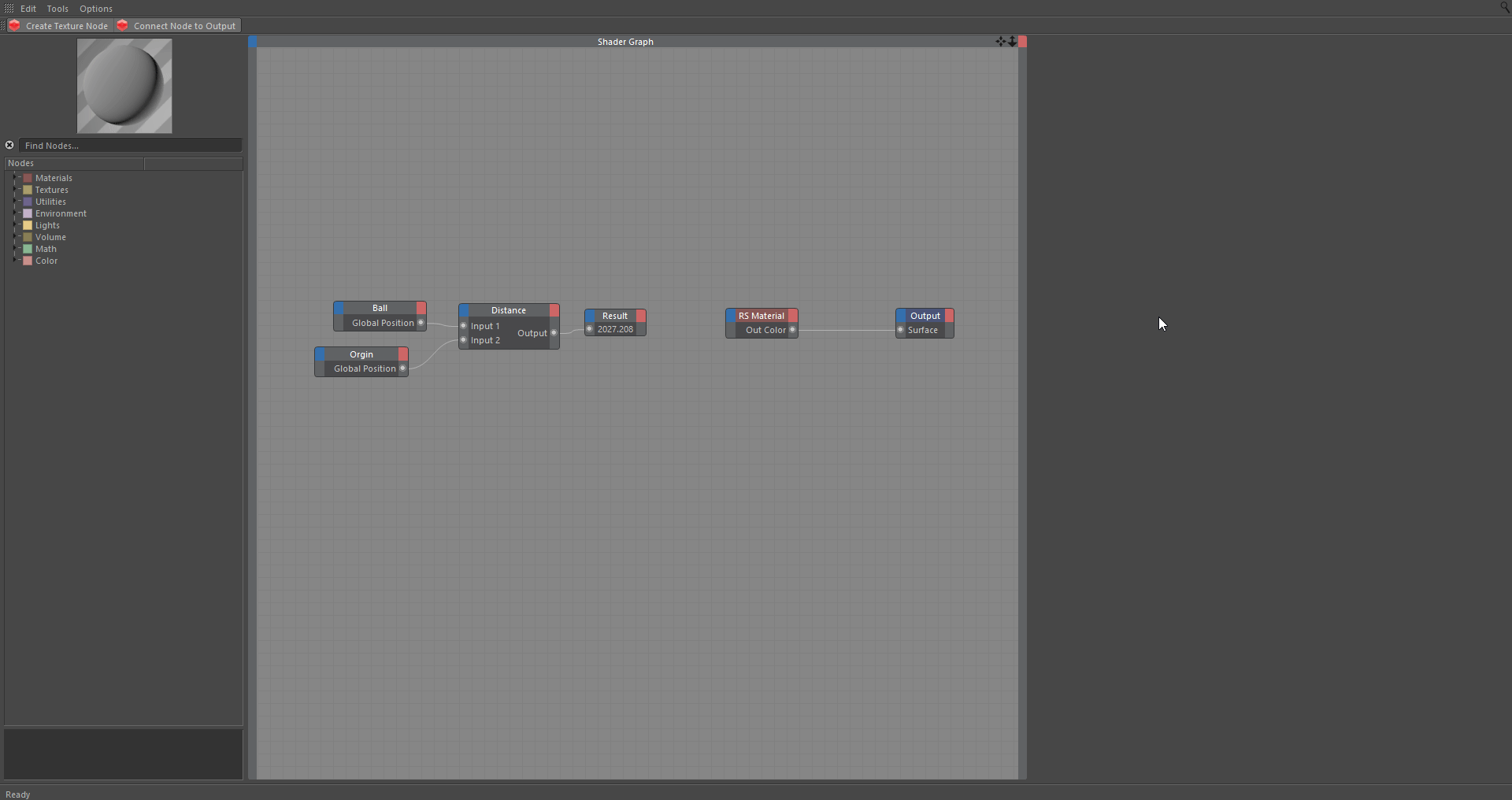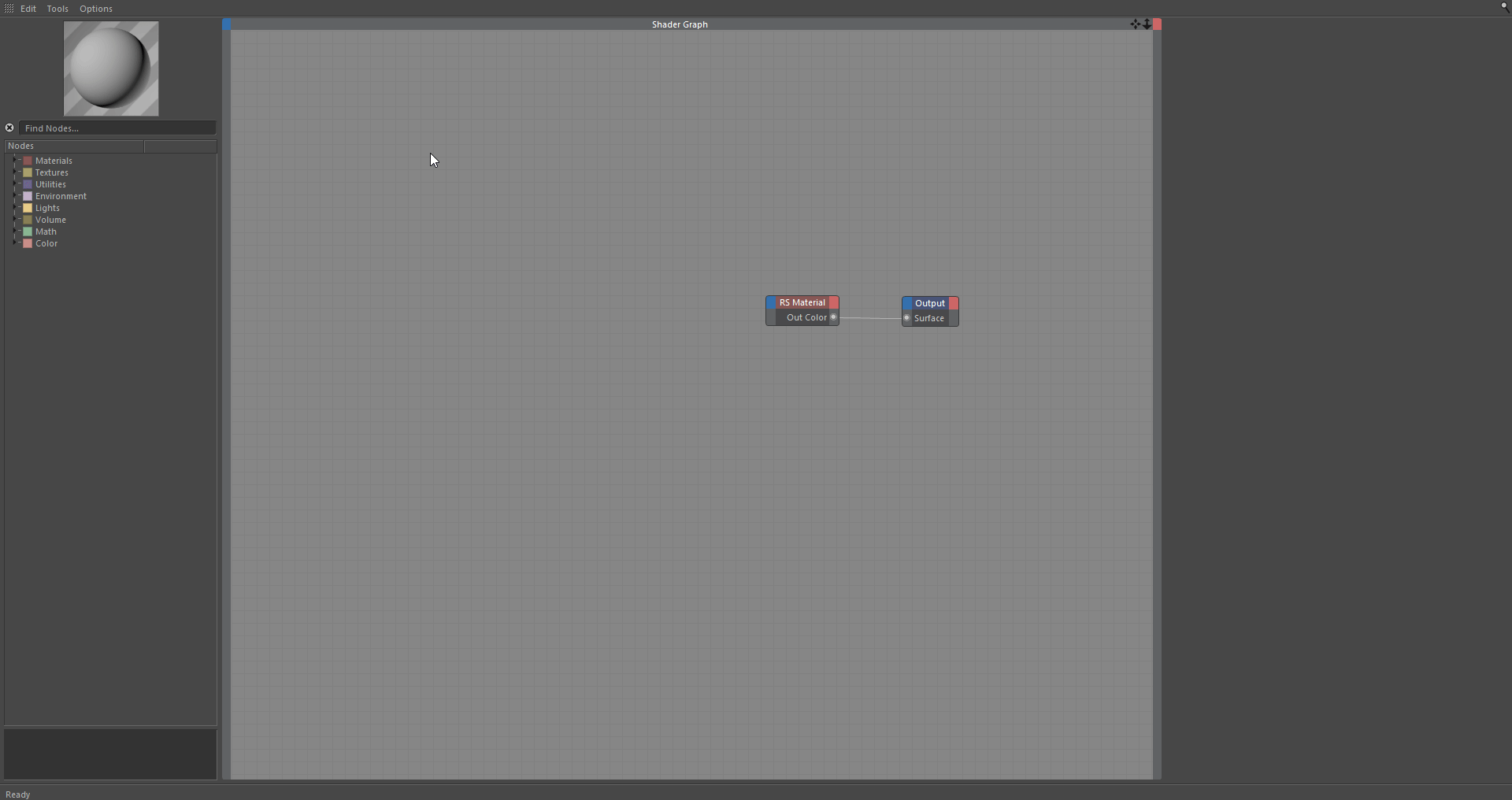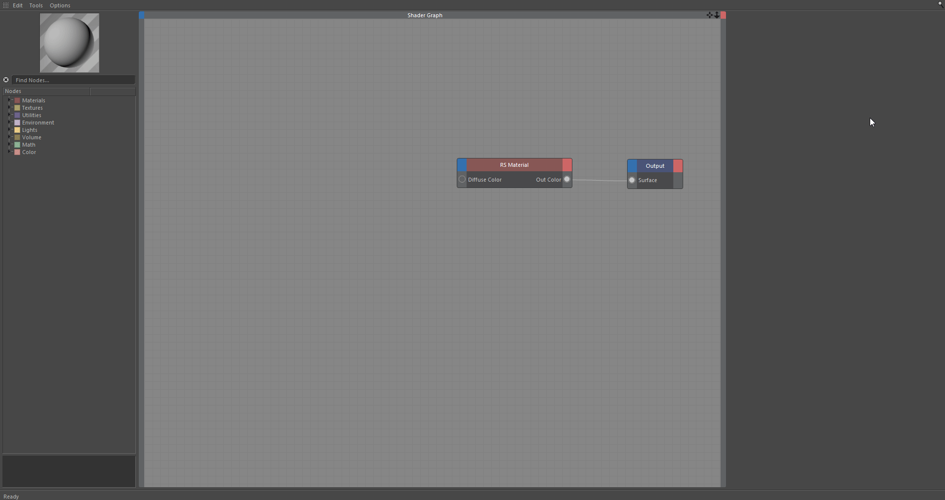 There are 8 different Categories of nodes to choose to from that include; Materials, Textures, Utilities, Environment, Lights, Volume, Math, and Color. Nodes inherit the color from their respected Categories once brought into the Graph Area.