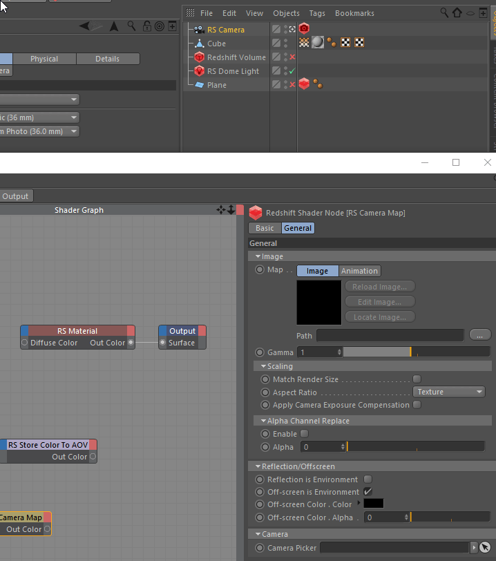 The C4D Shader node allows the use of Cinema 4D shaders in conjunction with RS Shaders. The built in Cinema 4D Shaders will be converted (Baked) into texture files, and then used typically with a RSTexture node for sampling the texture file. The C4D Shader is limited shaders that can be encoded into a 2D Texture, so other types of shaders (for example 3D shaders) are not supported.
