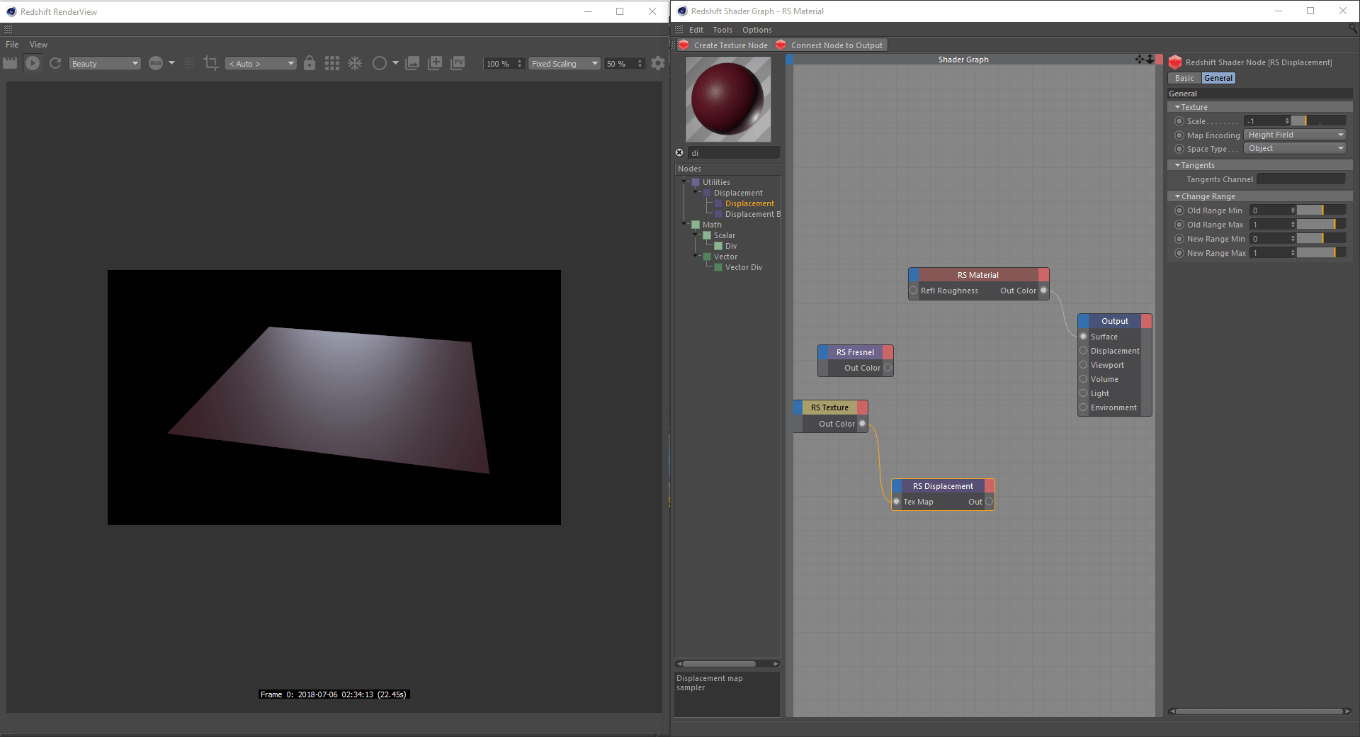 Material Displacement output. Used with nodes from the Displacement category. Requires geometry to have displacement enabled through an Redshift Object tag.