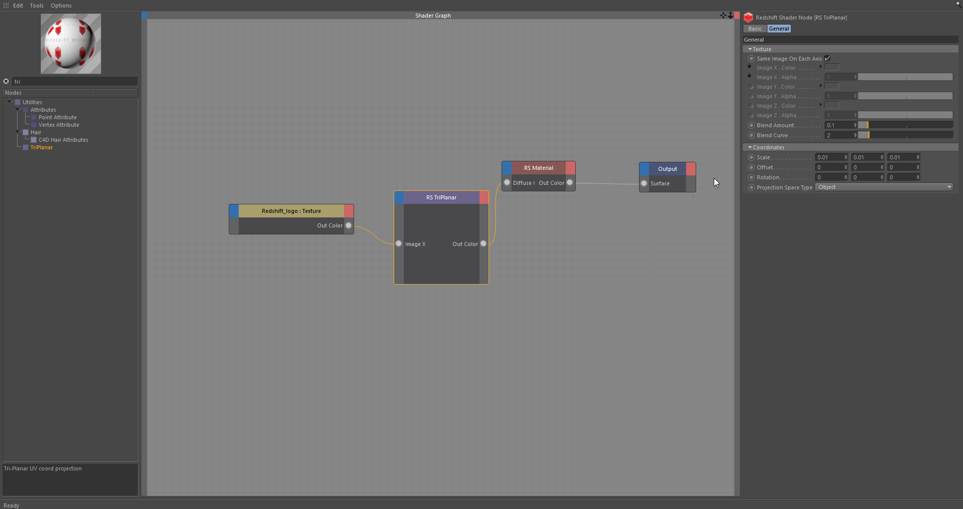 The Node Tree located on the far left, contains all the Redshift Shader Nodes that can be added to our Graph Area. The nodes are organized into Categories depending on the type of node or its functionality.