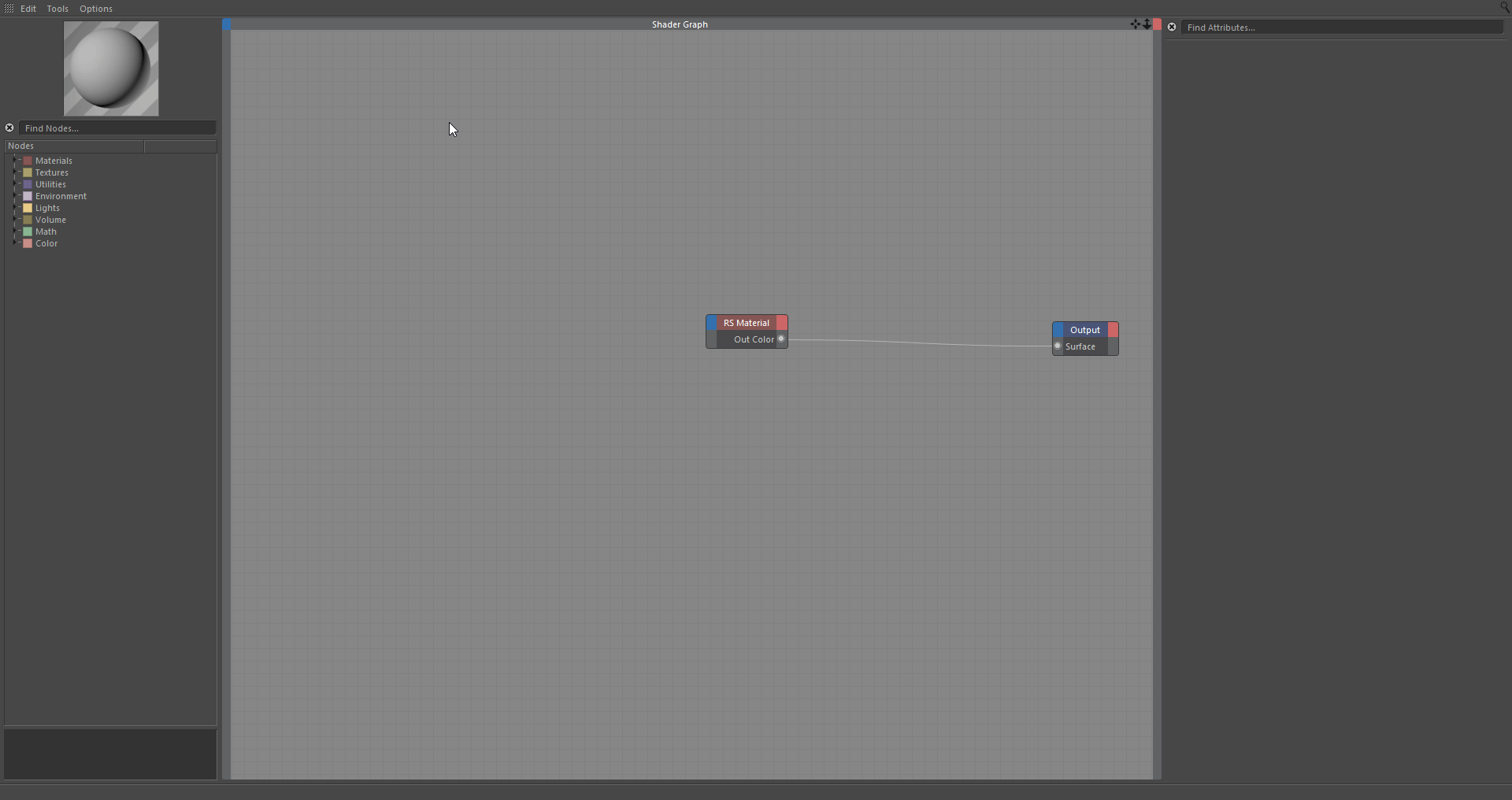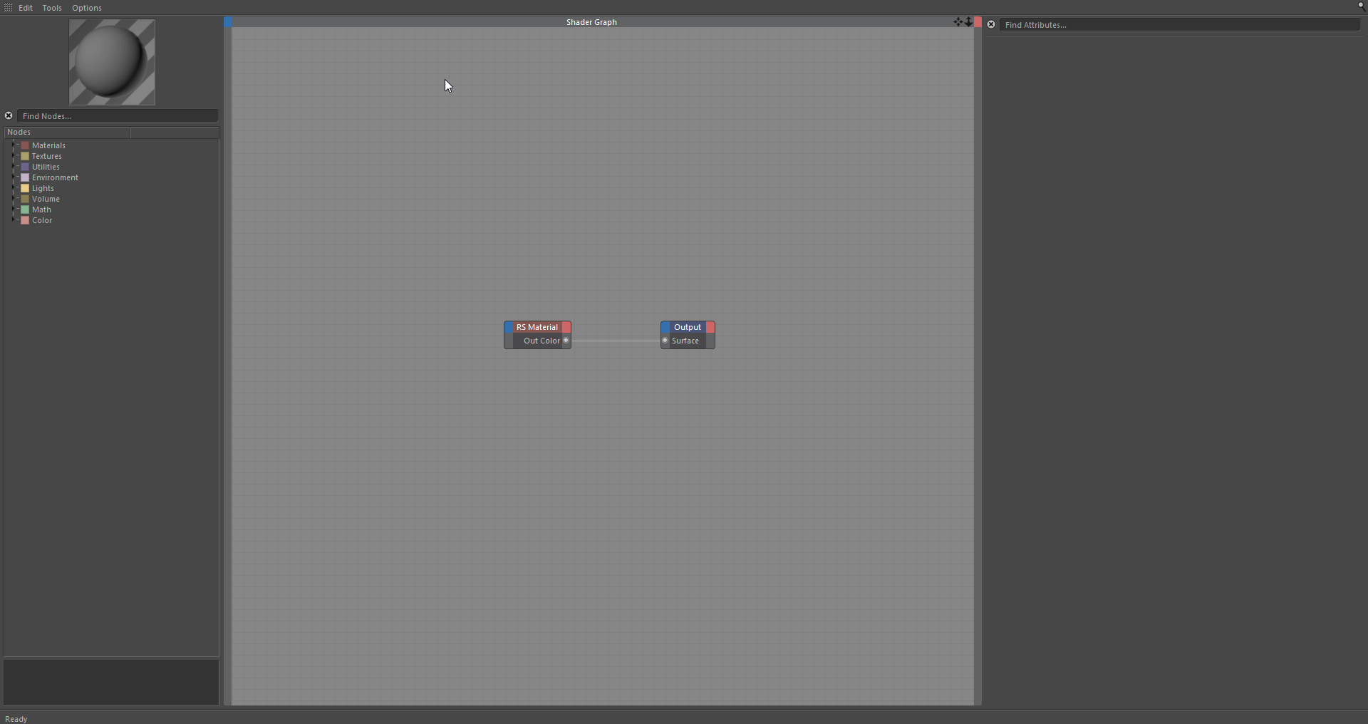 The Shader Graph Editor is broken up into a couple sections, the Node Tree which includes the Material Preview above, the Shader Graph Area, and the Attribute Manager which includes the Parameter Search box above.