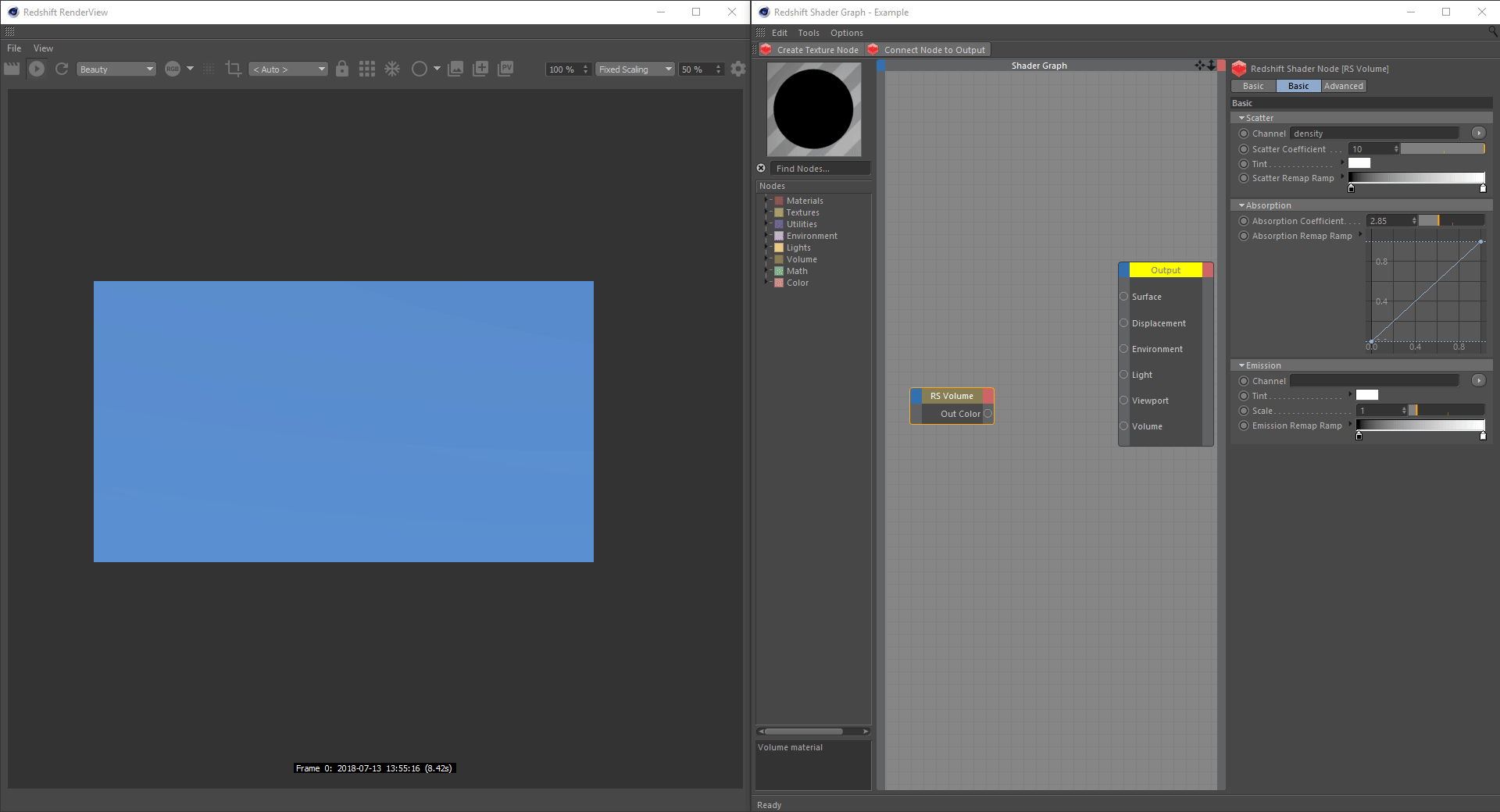 Material Volume output. Used with nodes from the volume category. Such materials are applicable only to Volume objects such as a Redshift Volume, or TFD Volume container. Volume materials should not have any other outputs connected.