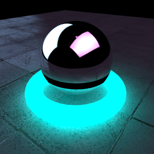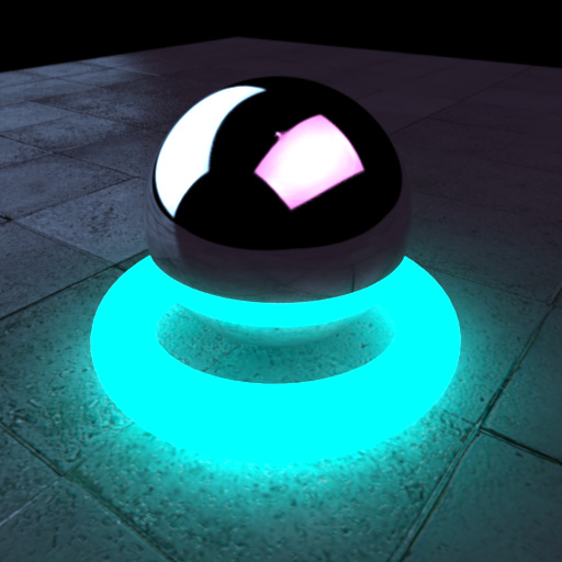 Here is a simple scene, demonstrating this; our 'emissive' mesh is a cyan torus with an intensity of 4.0 and all other settings to default. A chrome sphere sits in the middle of it, reflecting an HDR environment map, the ground and the emissive torus. No direct lights are present.