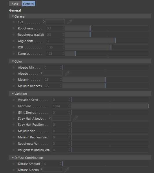 Real hair or fur does not have a diffuse component however increasing diffuse amount can be helpful when simulating dirty/damaged hair or other fibers that are not translucent. For the most realistic hair diffuse amount should be set to 0.
