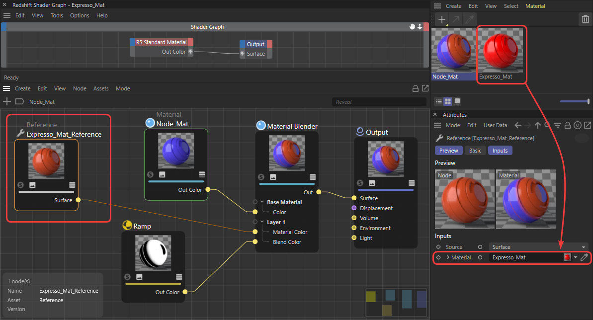 This node allows to link to another already existing Redshift material and to read out its Surface, Displacement or Environment and to make this information available for any other Redshift material.