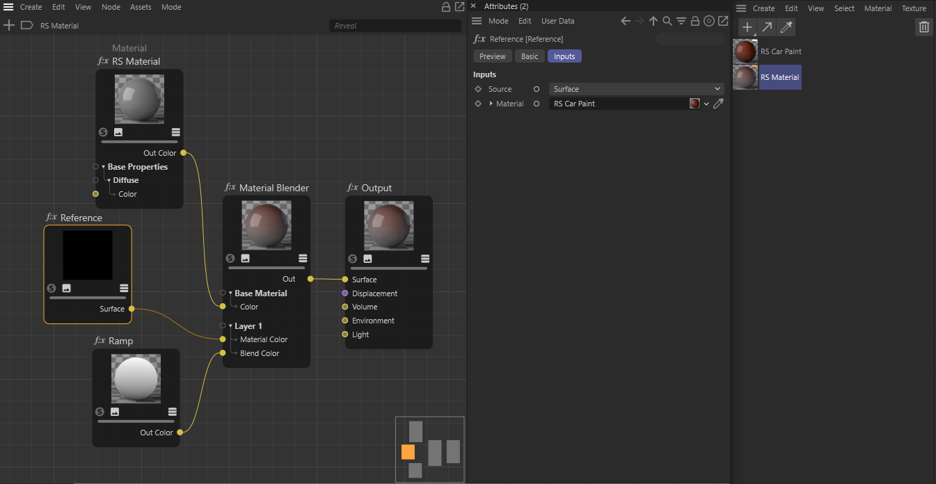 We open up the basic material in the Node Editor and add the Reference node to the setup. By dragging the Car Paint material from the Material Manager to the Material slot of the Reference node, we gain access to that material and can reference it for example for use with the Material Blender.