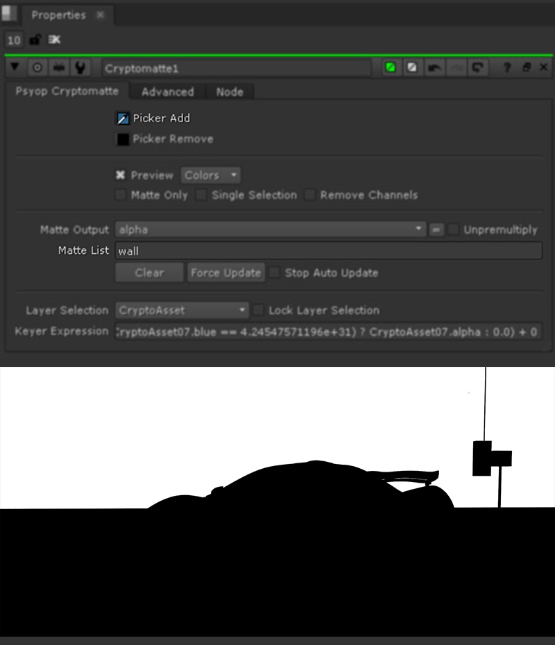Our example Cryptomatte inside of Nuke. Using the picker to select the Back Wall you will notice that the name we used earlier "wall" is now added to our Matte List. Using this system you can easily create custom names & group objects into specific mattes using attributes.