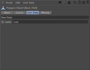 Now that we have created our new custom attribute you can see that the User Data section of our Back_Wall object has now expanded to include a new matte user data. This new String attribute also provides us with a space to type in any name we want. The name we enter here will be used by Cryptomatte to distinguish between the mattes it generates. For our example we chose to use the name wall to generate a matte specificaly for our Back_Wall object.