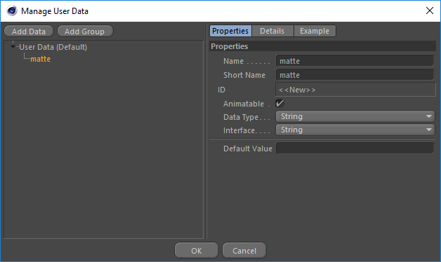 Clicking the Add User Data option will open up a new window which lets you create the new custom attribute. In this window for our example we will choose matte for the long name to match the attribute our Cryptomatte AOV is going to be look for. User Attribute ID Type only works with String, Integer and Float attribute data types. In this instance we will select String and then hit the ok button. This will now create our custom matte attribute in the User Data section of our Back_Wall object.