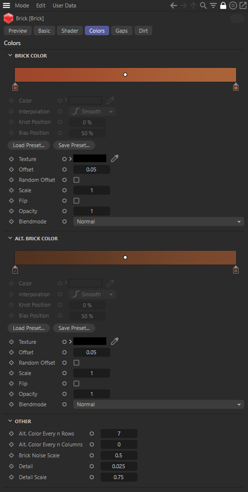 Controls how the dirt effect is blended on top of the bricks. If negative, applies linear dodge blending between the dirt layer and the brick color. If positive, applies linear burn blending between the dirt layer and the brick color. The magnitude of the value determines the strength of the blending effects. If the value is 0, regular alpha blending is applied.