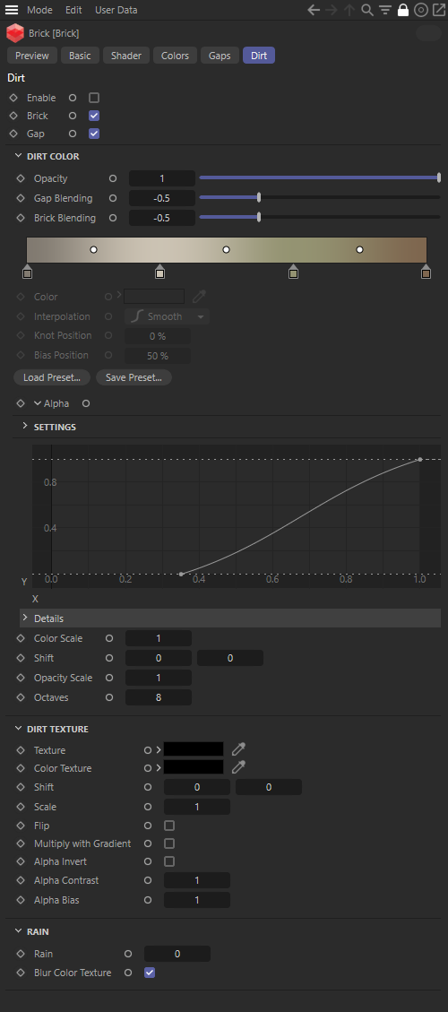 | Dirt Alpha Texture: Grunge map Multiply with Gradient: Enabled |
