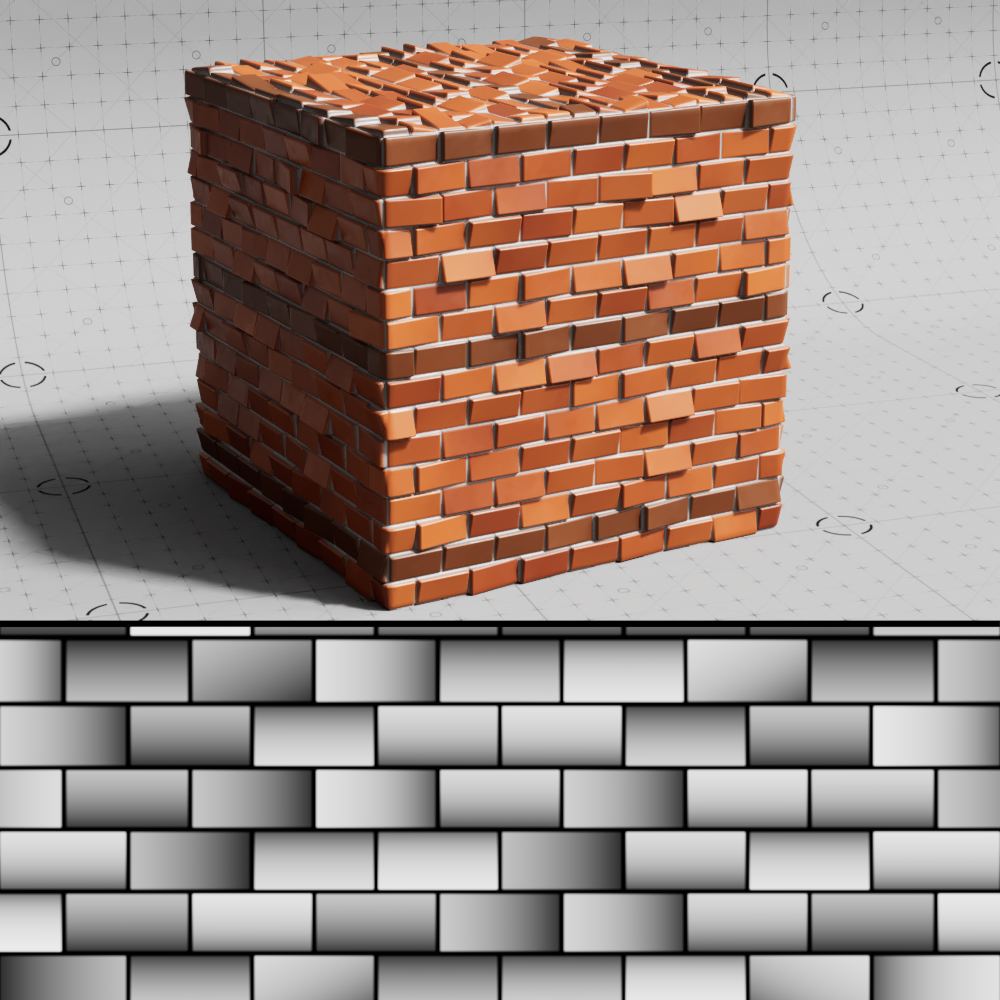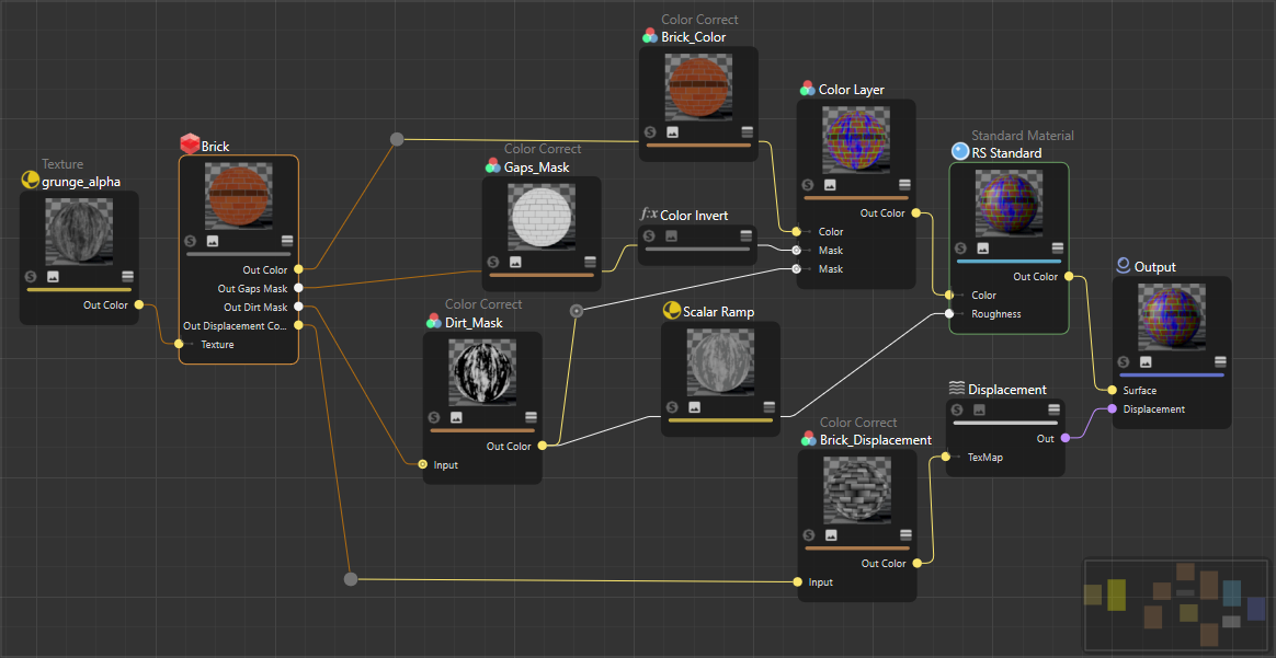 The Displacement Color output is being used to give the bricks in the scene actual 3D depth at render time.