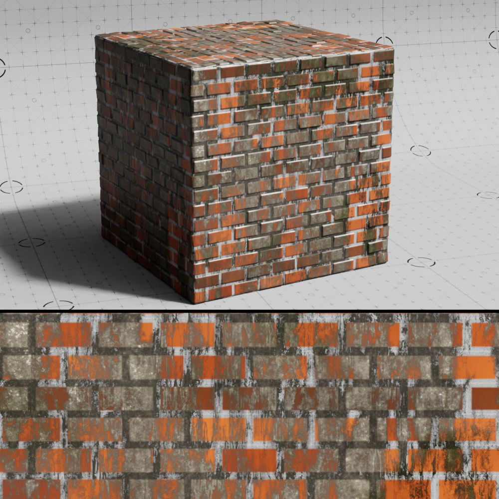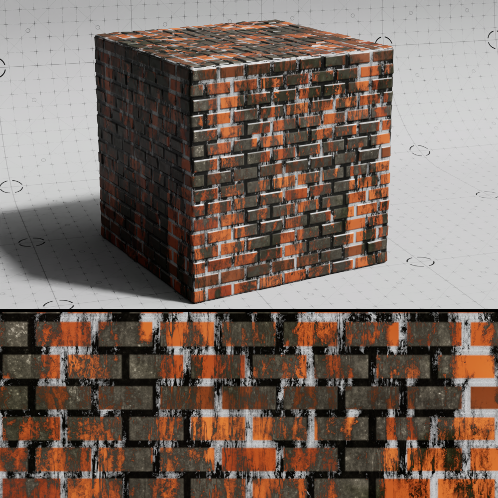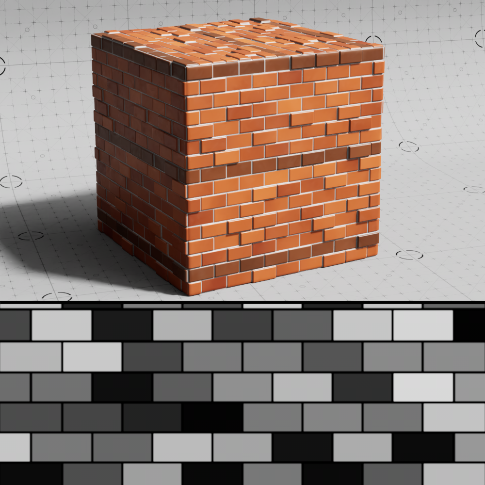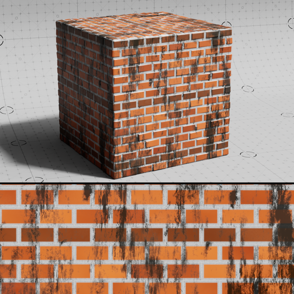 Black and white output for the dirt layer, this can be used to isolate the dirt layer from the rest of the bricks. Particularly helpful for driving things like reflection roughness which is likely to require a different roughness compared to the bricks surface.