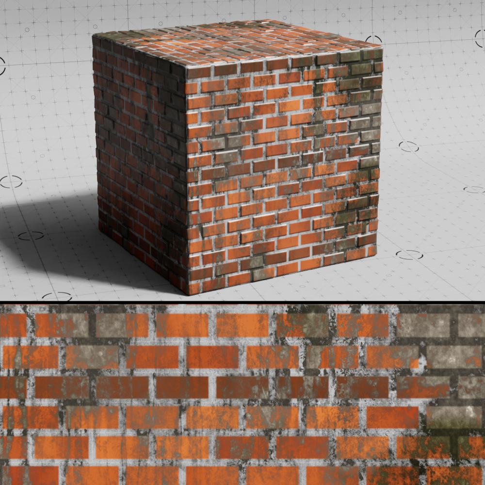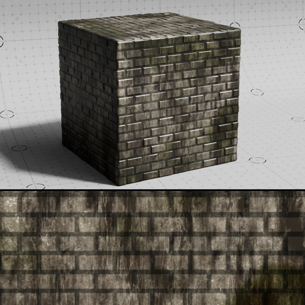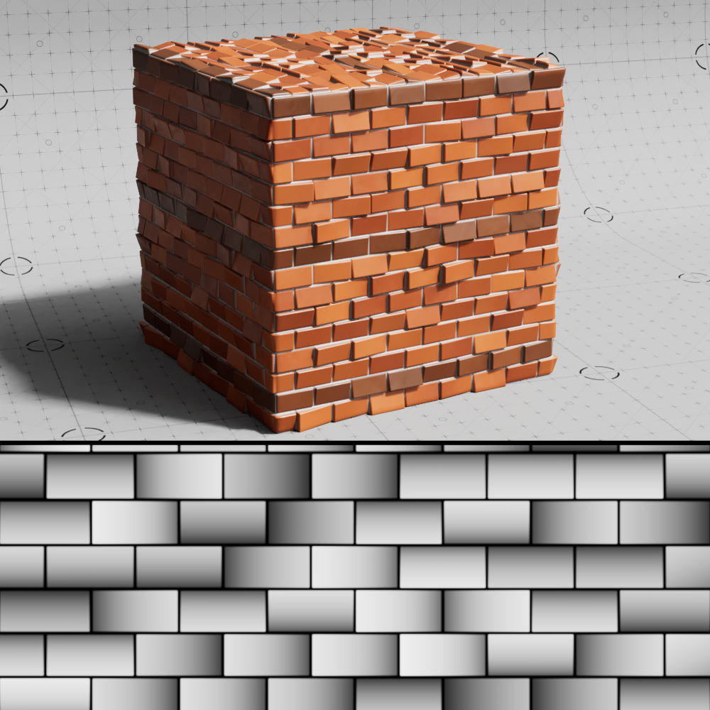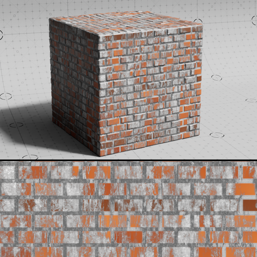 Black and white output for the dirt layer, this can be used to isolate the dirt layer from the rest of the bricks. Particularly helpful for driving things like reflection roughness which is likely to require a different roughness compared to the bricks surface.