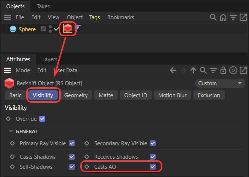 The same holds true for large objects with small details, the overall size and shape of an object is easier to catch with fewer samples than small surface details. If it's not important to catch each detail you can create a simplified proxy object used for distance calculation, this will reduce the number of samples needed to produce a clean result. You have two options to control if an object is included in distance calculation, by using the trace set functionality built into the distance shader or stopping an object from contributing to AO calculation. Since distance is calculated using Redshift's AO kernel all you need to do is disable "Casts AO" in the high detail Object's Visibility setting and it will never be considered a distance target — regardless of whether it is included in the distance trace set.