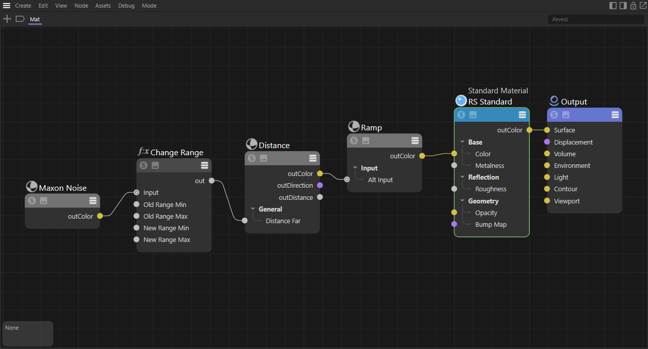 Colorization is accomplished simply by driving a ramp with the distance shader's OutColor, while textured distance effects are most easily handled by taking a texture (in this example a Maxon noise) and using something like a change range to control the minimum and maximum distance values. Both of these setups are demonstrated in the image below.