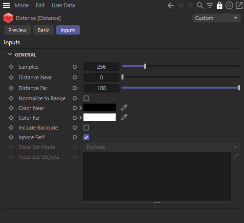 On this page an object with a distance shader applied to it is sometimes called a "distance catcher," you can think of this like a shadow catcher, it is an object that the distance effect is recorded onto. On the other hand, the objects that have their distance measured are sometimes called "distance targets" — like an object included in the trace set.