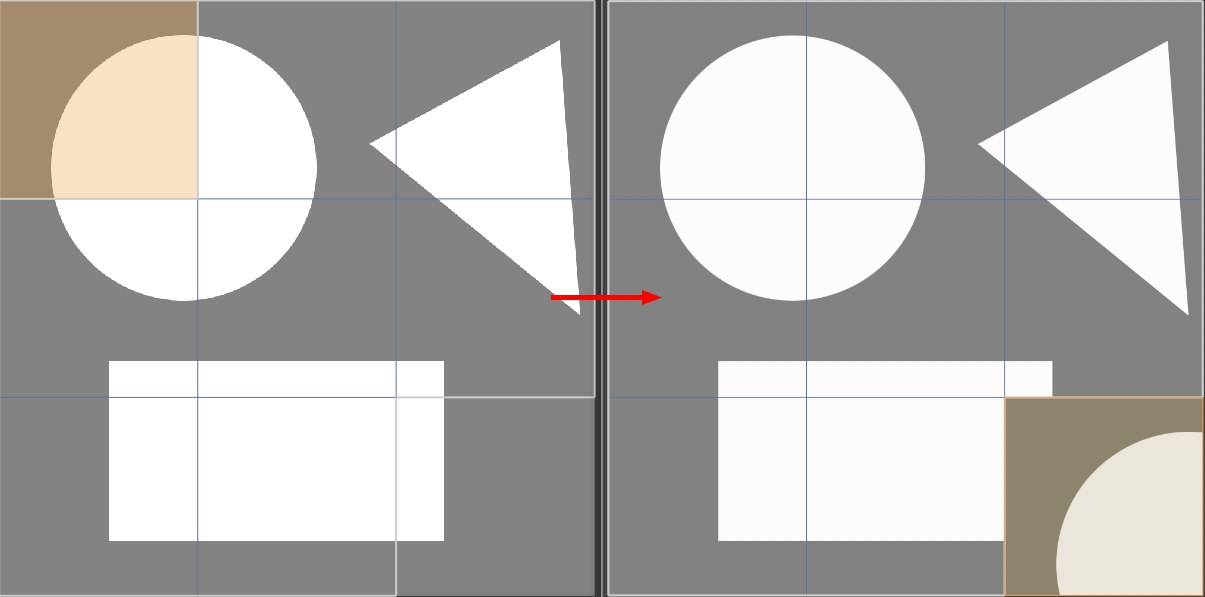 What's happening in the illustration above? First we selected the top left polygon and chose Copy UV. This copied the polygon's UV coordinates to the clipboard. We then selected the bottom right polygon and chose Paste UV. This applied the UV points stored in the clipboard to the bottom right polygon. Now the bottom right polygon displays exactly the same part of the texture as the top left polygon.