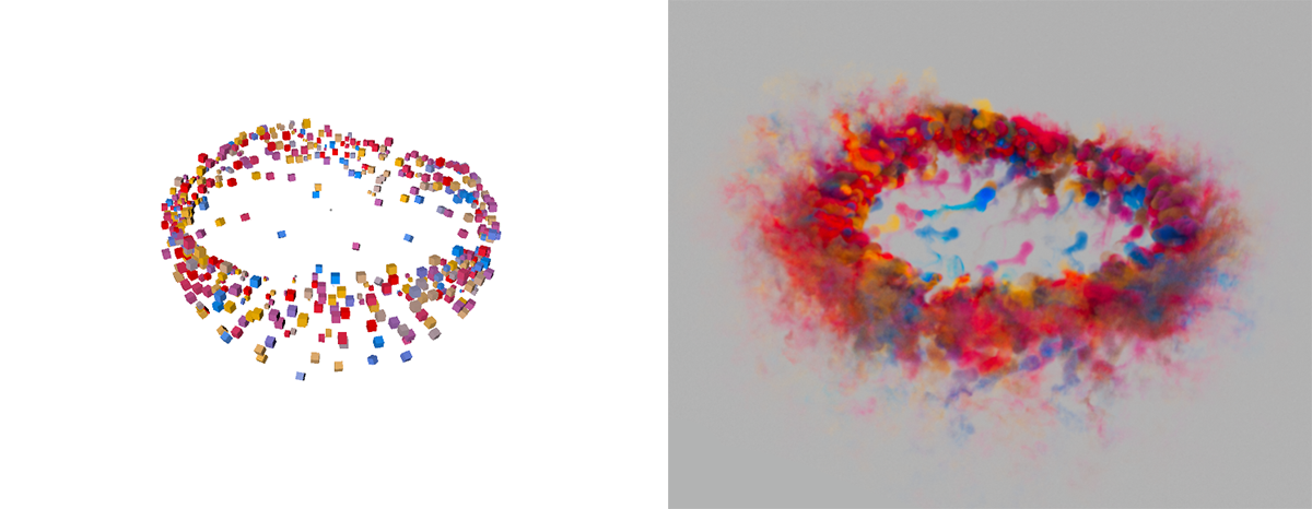 In the image above, from left to right, Voxel Sizes of 5cm, 1cm, and 0.1cm were used. The width of the deformed ring, which serves here as a Pyro Emitter, is about 20 cm. It can be clearly seen how reducing the Voxel Size leads to more effective filling of the ring with gas and to a more detailed simulation. At the same time, however, the simulation time increases considerably and the memory requirement also skyrockets.