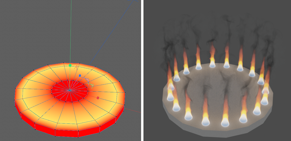 In the above example, a complete object was used as an Emitter. However, you can also define only parts of a surface as Emitters. This then also makes it possible, for example, for fire to spread slowly over an area or for smoke to linger only in certain places.