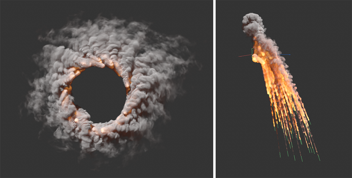 As can be seen in the figure above, a strong reduction of the Object Fidelity may lead to the fact that the entire object is no longer used as a Pyro Emitter. Accordingly, less smoke, hot gas or fuel are simulated there. Likewise, the distribution of the generated gas can become more uneven, as only the more voluminous sections of the object are filled with gas. However, the figure also makes it clear in this example that the differences can be quite small in some cases. Thus, the difference between the middle and right simulation result turns out to be quite small. However, we save many Voxels in the volume.
