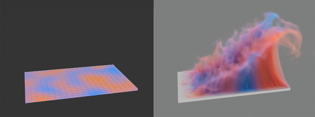An additional option is the subsequent upscaling of the voxel set to add additional details to a lower resolution simulation without having to change the basic shape of the simulation. Normally, it is the case that the course of a simulation changes when smaller voxels are used. This makes it difficult to use a quick simulation with large voxels and then simply downscale the voxels for rendering. However, by using the so-called Upres function, the existing simulation data can also be used, subsequently subdivided and detailed by superimposing a noise structure.