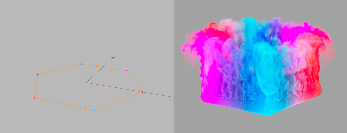 Vertex colors can also be used for the points on splines and have the advantage that the color values are automatically interpolated between neighboring spline points. You can find an example of this in the figure below. There, on a converted N-Side spline, the six vertices were individually colored by the paint function of the Vertex Color tag. If a Pyro Emitter tag is then assigned to the spline and the Surface mode is used there, Density can be generated in the area of the spline. If we then assign the vertex colors as a Color mMp, appropriately colored smoke is automatically created. Note that to render these colors, the On Export setting must be enabled for the colors on the Pyro Output object!