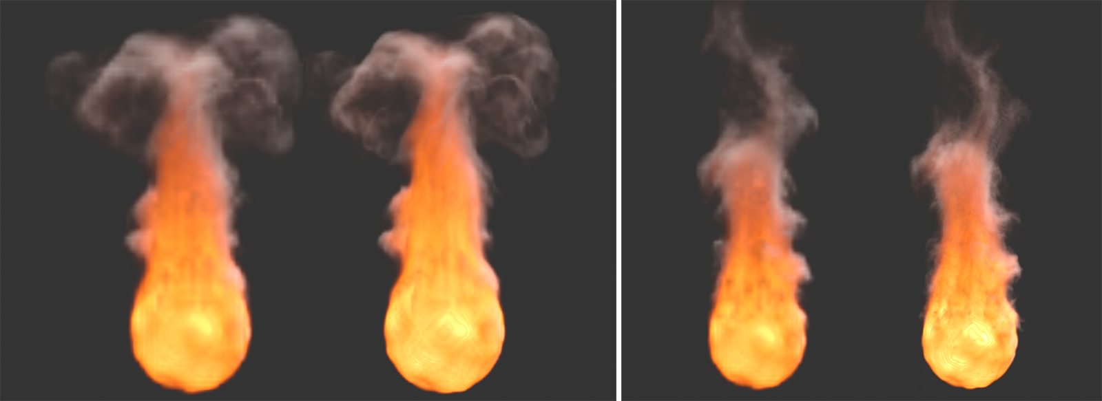 Here are examples of the Upres effect. The left flames in both examples were simulated with low voxel density. To the right of each is the version simulated by Upres. There, more details are visible and the result appears sharpened.