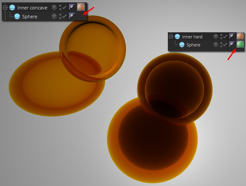 Left: Concave, absorbing objects, no Boole; right: Two objects with different absorbing materials.