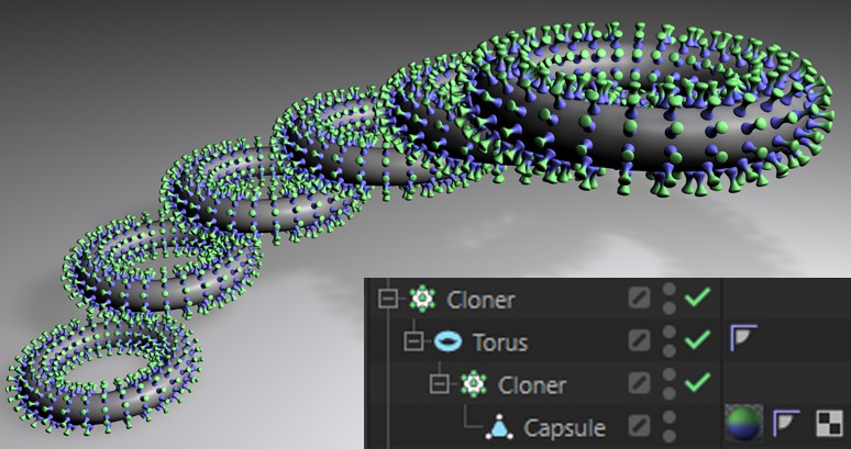 What is happing in this scene? The upper Cloner object (in Grid mode) clones a ring several times in a grid pattern. The Cloner object was then made a Child of a Connect object, which means that all rings will be internally regarded as a single object. This makes it possible for the lower Cloner object (in Object mode) to arrange spheres on the surface of the rings, i.e., on the entirety of the clones.