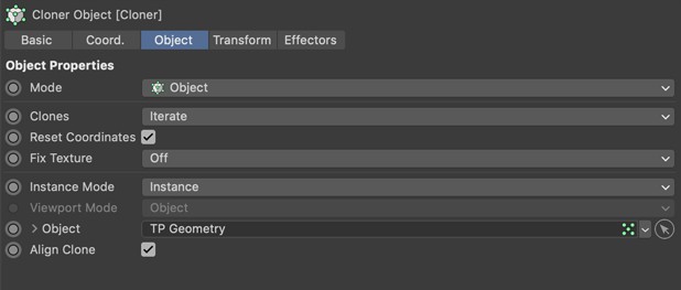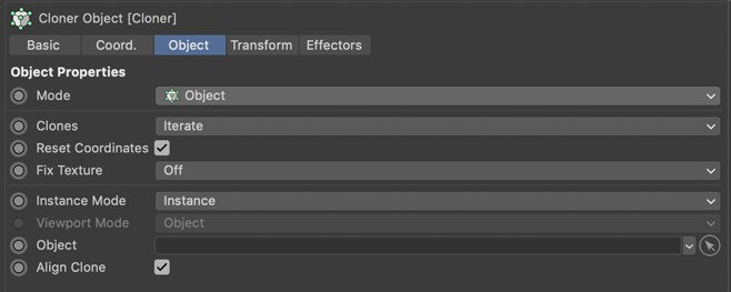 - Axis: On the object axis, which normally results in exactly 1 clone. However, this mode is intended if you do not want to distribute the objects on a polygonal object, but on another clone or matrix object, for example. The clones produced by these (or their origins) will be used for distribution.