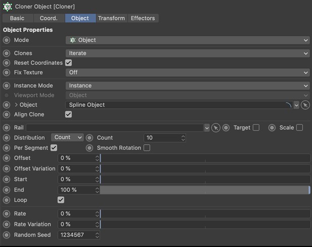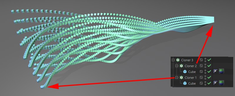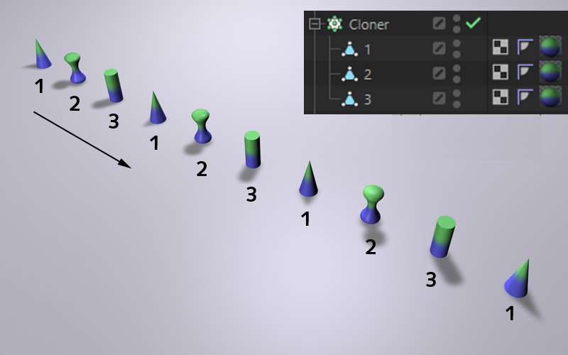 In this mode, the objects are made Child objects of the Cloner object - starting from the origin of the Cloner object - are arranged in a row, which can also have an arc shape. Each clone is moved, rotated or scaled a little, depending on what you have set under Position, Rotation and Scale further down in the dialog.