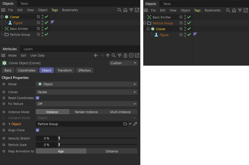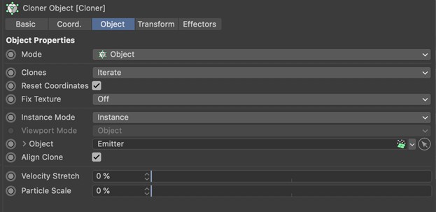 Here you can drag in Particle Groups, polygon objects, splines or MoGraph Matrix objects, for example, if you do not want to use the Cloner object in this way by arranging the Shaping object as a parent object. Depending on which object is used as the shape, various parameters are displayed, which are described below.