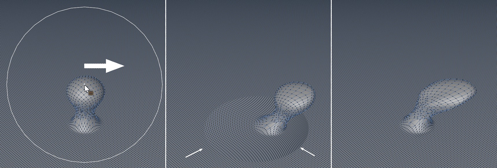 Drags the mesh in the direction of the point Normals at the center of the tool (does not work in conjunction with splines).
