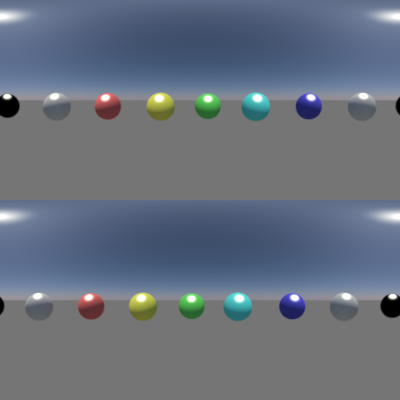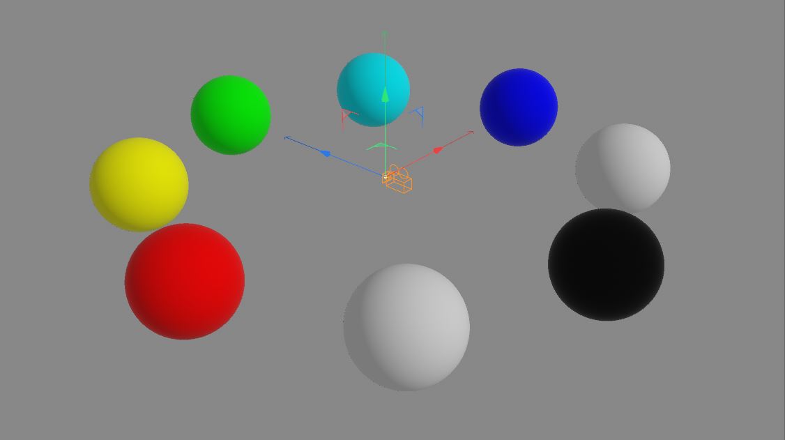 To demonstrate the effect of the stereo spherical camera, we'll use the following reference scene. The camera is pointing towards the green sphere. The red sphere is 90 degrees to the left of the camera and the blue sphere is 90 degrees to the right. The black sphere is exactly behind the camera.