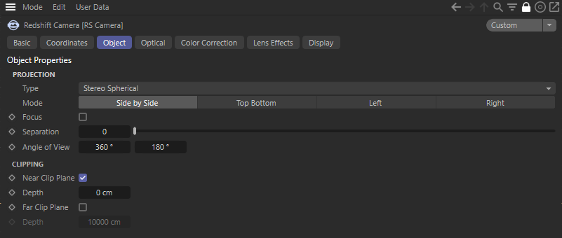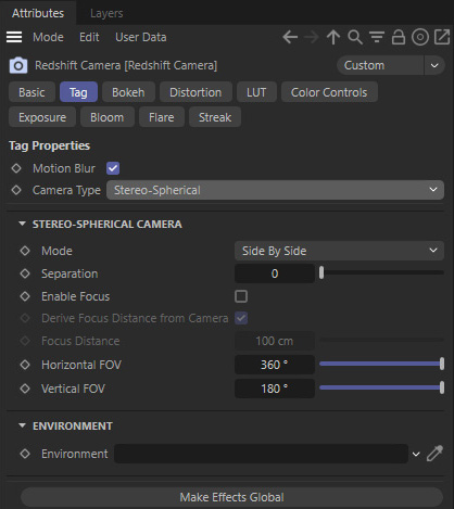For these examples, we used the default 360 degree horizontal and 180 degree vertical FOV settings. The "Side By Side" image was rendered with a 4:1 aspect ratio. The "Top Bottom" with a 1:1 aspect and the "Left Only" and "Right Only" images with a 2:1 aspect ratios.