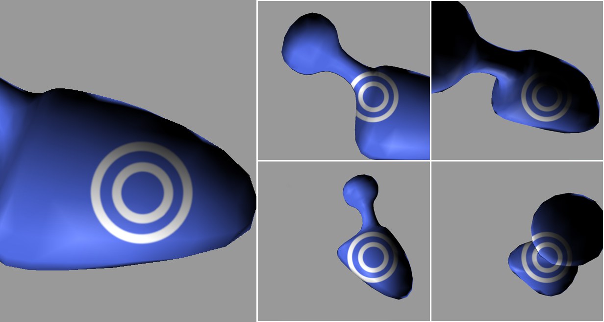 Die links aufgebrachte Bemalung wird durch Variieren der Ansicht zurechtgerückt.