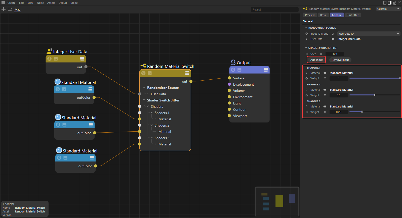 First create a Random Material Switch and connect it to the Surface port of the Material Output node. Then decide how the randomization will be distributed in your scene, this is controlled by the Input ID Mode. You can either set the Input ID Mode to a built-in ID like “Name ID” or use a custom ID by selecting “User Data” and connecting a user data node like Integer User Data as used in the example below.