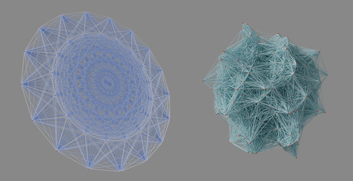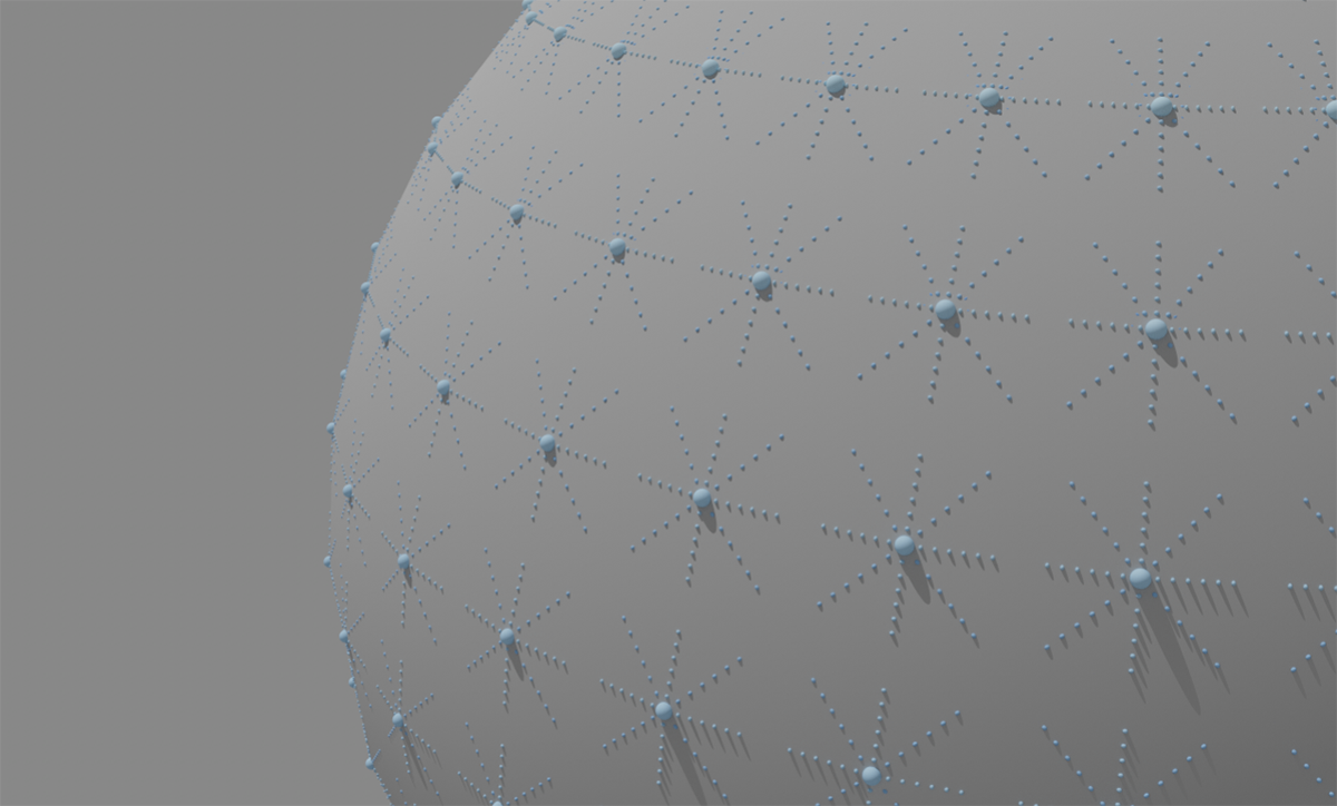 Diese Node-Kapsel berechnet zylindrische Verbindungen zwischen den Punkten einer zugewiesenen Geometrie. Dies kann für abstrakte Visualisierungen wie die oben abgebildeten genutzt werden. Dabei lassen sich auch die in Partikel-Gruppen verwalteten Positionsdaten von Partikeln auswerten (rechts zu sehen).