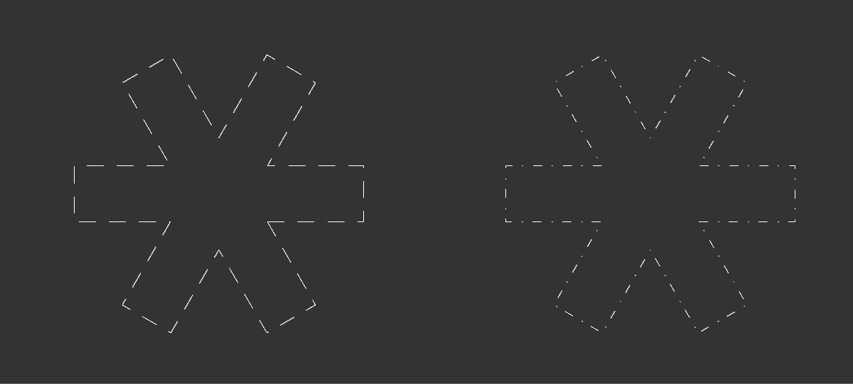 In diesem Beispiel wurde ein eckiger Stern Spline verarbeitet. Durch die individuell einstellbare Anzahl der Striche und deren Abstand entlang des Splines, lassen sich verschiedene Arten von Strichlinien umsetzen. Da auch mehrere Nodes auf die gleiche Spline-Geometrie angewendet werden können, sind auch Strichpunktlinien, wie in der rechten Bildhälfte möglich.